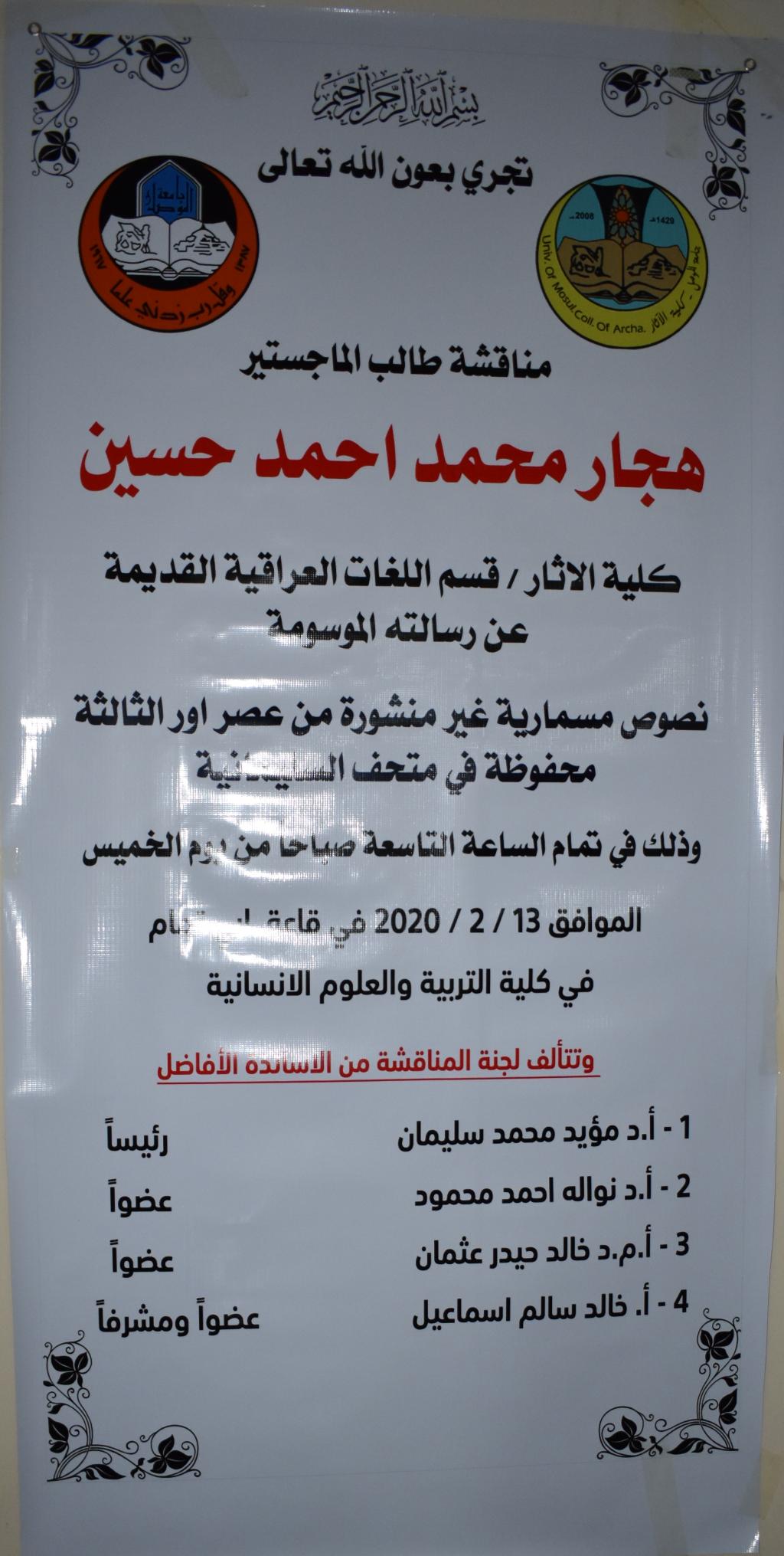 تم بعون الله تعالى مناقشة رسالة الماجستير الموسومة (نصوص مسمارية غير منشورة من عصر أور الثالثة محفوظة في متحف السليمانية) للطالب هجار محمد أحمد حسين قسم اللغات العراقية القديمة / كلية الآثار / جامعة الموصل يوم الخميس الموافق 2020/2/13 على قاعة أبي تمام في كلية التربية للعلوم الإنسانية تألفت لجنة المناقشة كل من :