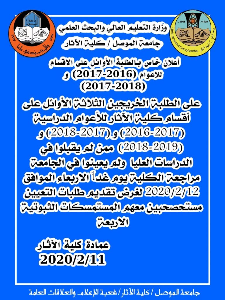 اعلان خاصة بالطلبة الخريجين الثلاثة الأوائل على الأقسام للأعوام (2016-2017) و (2017-2018) و (2018-2019)