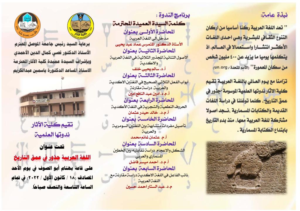 بمناسبة يوم اللغة العربية تقيم كلية الآثار ندوتها العلمية الموسومة(اللغة العربية جذور في عمق التاريخ)يوم الأحد الموافق 2022/12/18 الساعة التاسعة والنصف صباحاً على قاعة الدكتور بهنام أبو الصوفالدعوة عامة للجميع