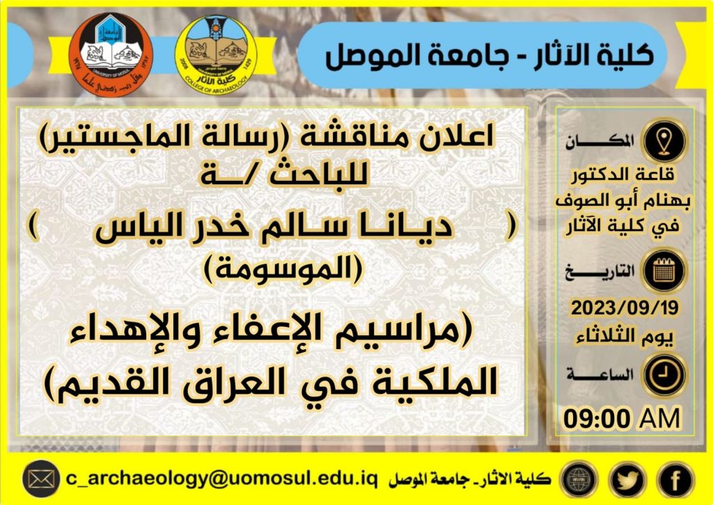 موعد مناقشة أطروحة الدكتوراه الموسومة (معطيات علم الآثار في سهول ديالى في ضوء الاكتشافات الأثرية)