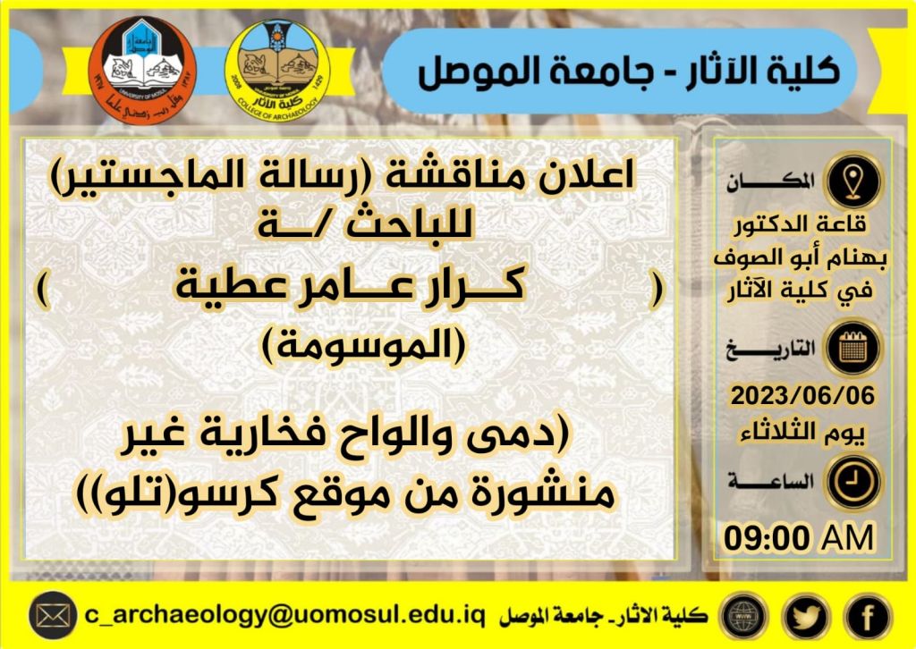 موعد مناقشة رسالة الماجستير الموسومة (دمى والواح فخارية غير منشورة من موقع كرسو (تلو))