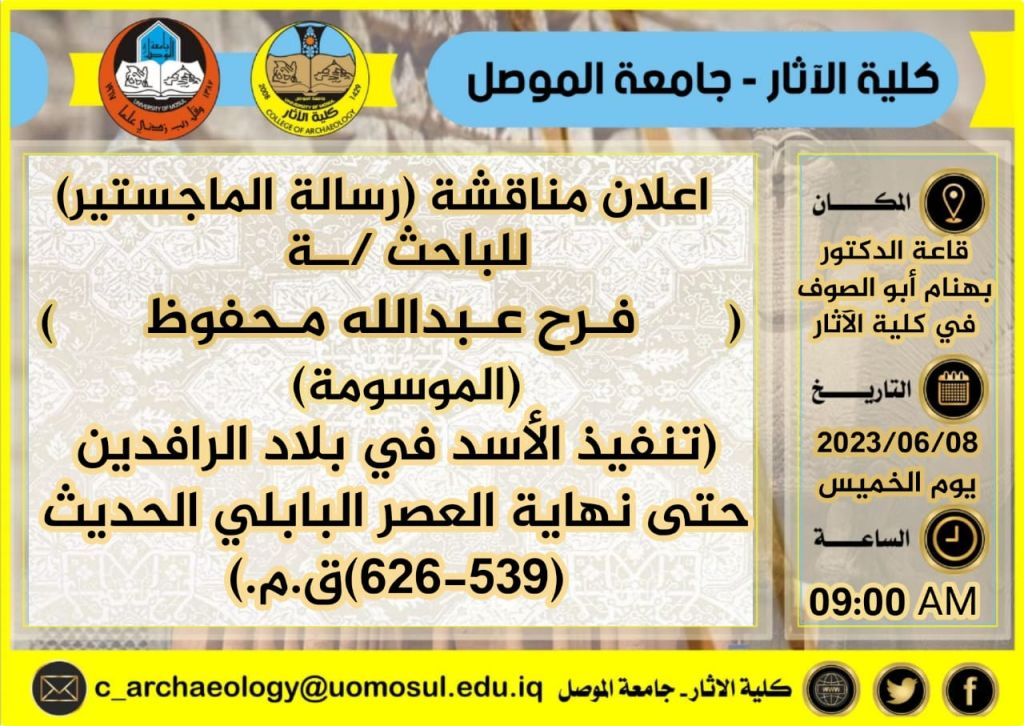 موعد مناقشة رسالة الماجستير الموسومة (تنفيذ الاسد في بلاد الرافدين حتى نهاية العصر البابلي الحديث (539-626) ق.م.)