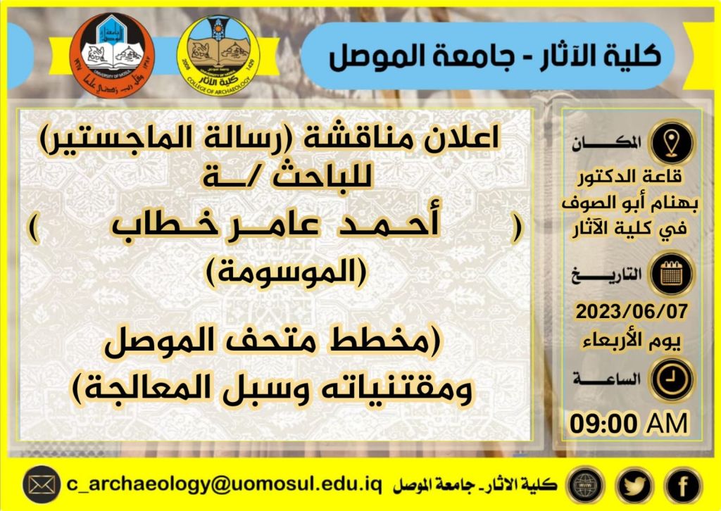 موعد مناقشة رسالة الماجستير الموسومة (مخطط متحف الموصل ومقتنياته وسبل المعالجة)