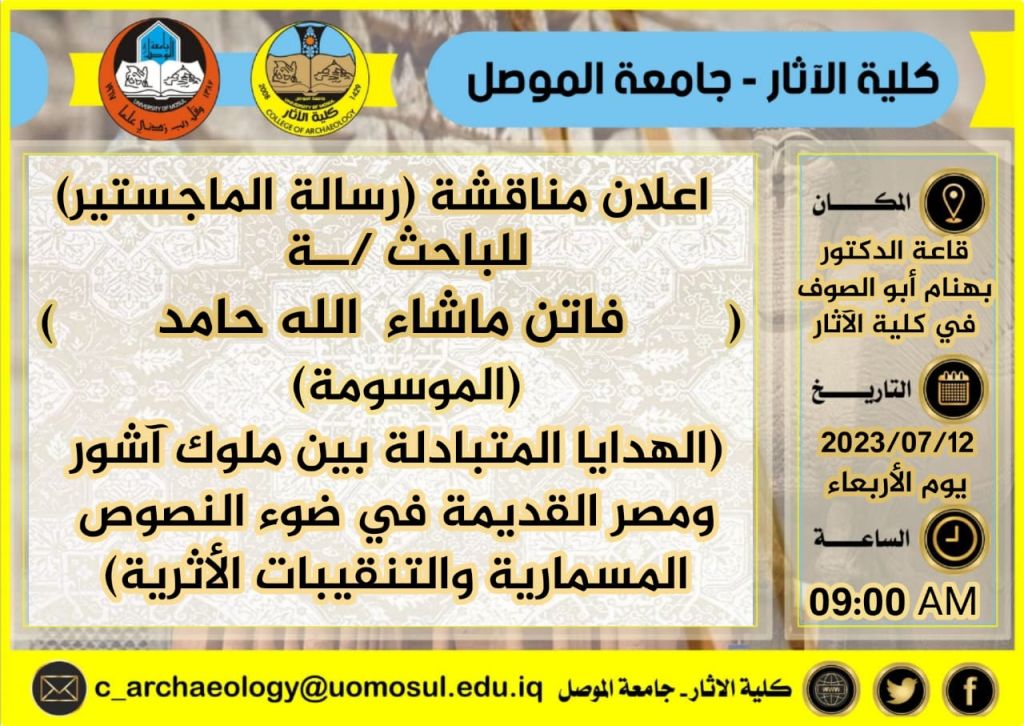 موعد مناقشة رسالة الماجستير الموسومة (المباني التراثية في مدينة زاخو – دراسة ميدانية لنماذج منتخبة)