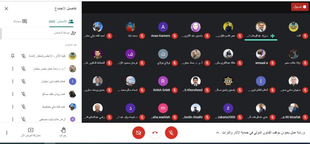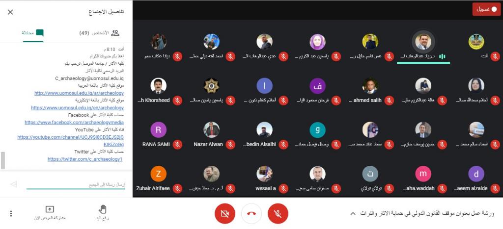 اقامت كلية الآثار / وحدة التعليم المستمر بالتعاون مع شبكة النهرينورشة عمل بعنوان (موقف القانون الدولي في حماية الآثار والتراث) القاها أ.م.د. زياد عبدالوهاب النعيمي ، يوم الخميس 2021/2/18 في الساعة الثامنة مساءً عبر الفضاء الإلكتروني وعلى منصة Google Meet ، بين الباحث خلال الورشة القوانين والاتفاقيات الدولية الخاصة بحماية الآثار والتراث ، وفي نهاية الورشة فتح باب النقاش بين الباحث والحضور.