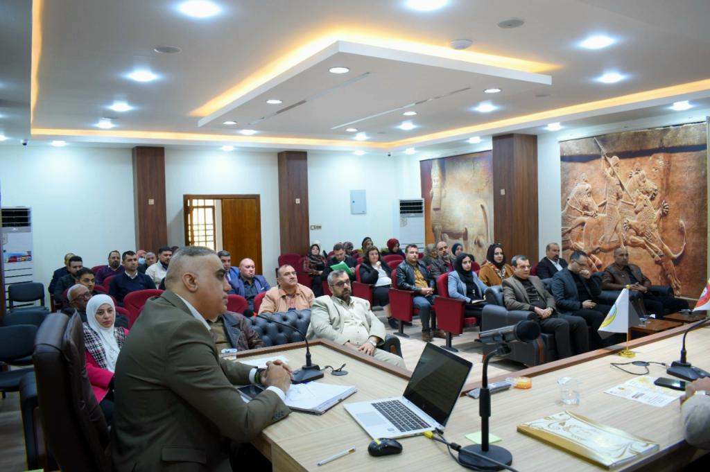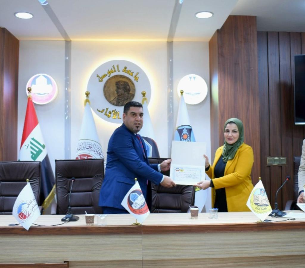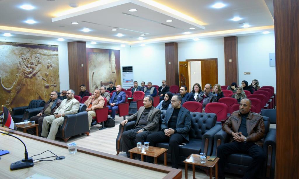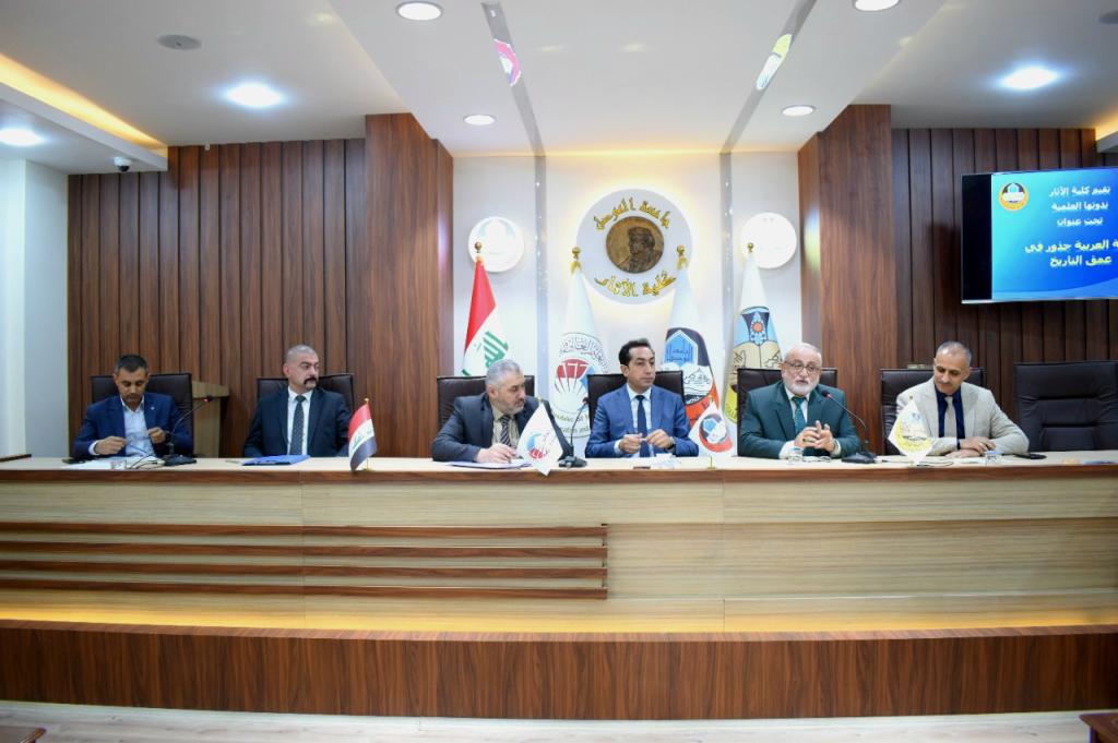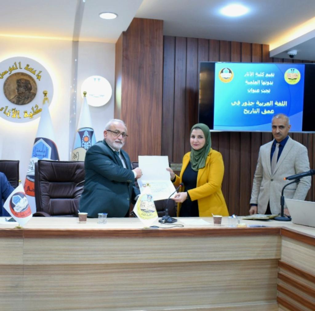بمناسبة يوم اللغة العربية اقامت كلية الآثار ندوتها العلمية الموسومة(اللغة العربية جذور في عمق التاريخ)يوم الأحد الموافق 2022/12/18 الساعة التاسعة والنصف صباحاًعلى قاعة الدكتور بهنام أبو الصوفبحضور أ.م.د. ياسمين عبدالكريم محمد علي عميد الكلية وعدد من أساتذة وطلبة الاثارتكون الندوة من ثمان محاضراتالمحاضرة الأولــى بعنوانمدخل الى اللغة العربيةالأستاذ الدكتور المتمرس عماد عبد يحيىالمحاضرة الثانيــة بعنوانالأصول الثنائية للجذور الثلاثية في اللغة العربية والاكديةأ. د. سالم يحيى خلفالمحاضرة الثالثــة بعنوانأبواب الفعل الثلاثي الصحيح في اللغتين الاكدية والعربية، دراسة مقارنةأ. م. د. امين عبد النافع امينالمحاضرة الرابعة بعنوانالحروف النطعية والشجرية في اللغة الأكديةأ. م. د. خالد حيدر عثمانالمحاضرة الخامسة بعنوانتأصيل مفردات متشابهة بين اللغتين السومرية والعربيةأ. م. عثمان غانم محمدالمحاضرة السادسة بعنوانالشكل والاعجام، دراسة تقابليه بين الخطين المسماري والعربيأ. م. د. احمد ميسر فاضلالمحاضرة السابعة بعنواننائب الفاعل في اللغة الاكدية دراسة مقارنة مع اللغة العربيةم. د. عبد الستار احمد حسينالمحاضرة الثامنة بعنوانجسور التواصل بين اللغات العراقية القديمة واللغات العاربة المحكية (الفصيحة والعامية)م. م. محمد خضر عباسوخرجت الندوة بتوصيات مهمة