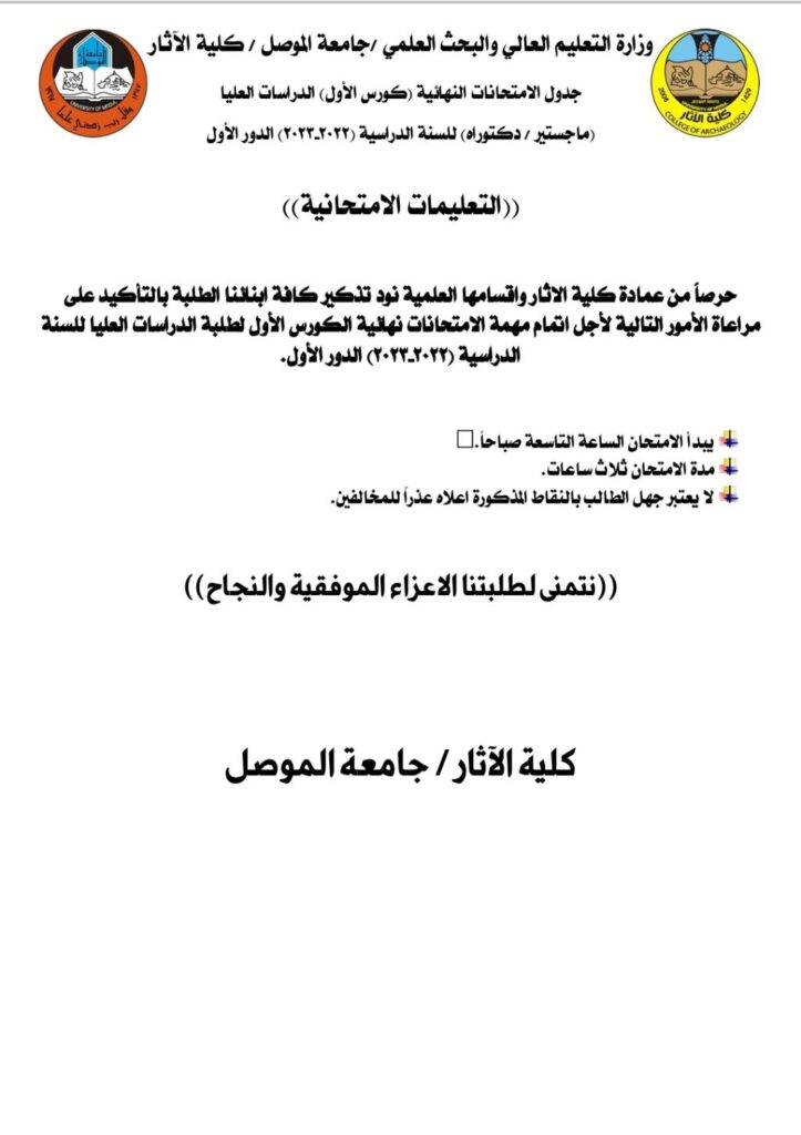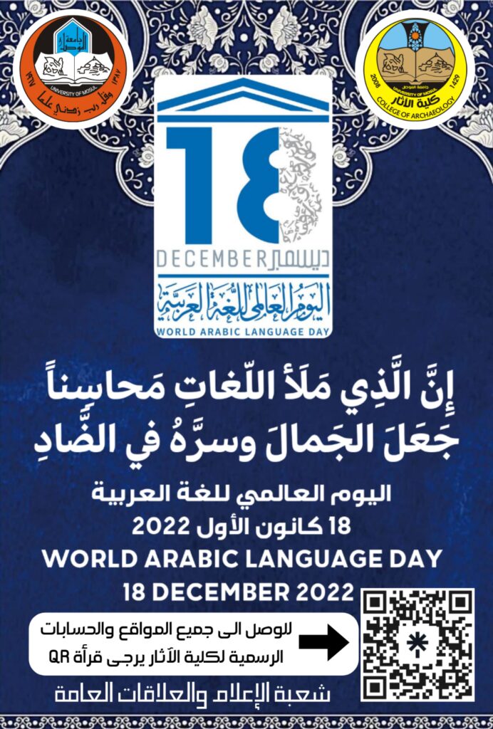 بمناسبة يوم اللغة العربية اقامت كلية الآثار ندوتها العلمية الموسومة(اللغة العربية جذور في عمق التاريخ)يوم الأحد الموافق 2022/12/18 الساعة التاسعة والنصف صباحاًعلى قاعة الدكتور بهنام أبو الصوفبحضور أ.م.د. ياسمين عبدالكريم محمد علي عميد الكلية وعدد من أساتذة وطلبة الاثارتكون الندوة من ثمان محاضراتالمحاضرة الأولــى بعنوانمدخل الى اللغة العربيةالأستاذ الدكتور المتمرس عماد عبد يحيىالمحاضرة الثانيــة بعنوانالأصول الثنائية للجذور الثلاثية في اللغة العربية والاكديةأ. د. سالم يحيى خلفالمحاضرة الثالثــة بعنوانأبواب الفعل الثلاثي الصحيح في اللغتين الاكدية والعربية، دراسة مقارنةأ. م. د. امين عبد النافع امينالمحاضرة الرابعة بعنوانالحروف النطعية والشجرية في اللغة الأكديةأ. م. د. خالد حيدر عثمانالمحاضرة الخامسة بعنوانتأصيل مفردات متشابهة بين اللغتين السومرية والعربيةأ. م. عثمان غانم محمدالمحاضرة السادسة بعنوانالشكل والاعجام، دراسة تقابليه بين الخطين المسماري والعربيأ. م. د. احمد ميسر فاضلالمحاضرة السابعة بعنواننائب الفاعل في اللغة الاكدية دراسة مقارنة مع اللغة العربيةم. د. عبد الستار احمد حسينالمحاضرة الثامنة بعنوانجسور التواصل بين اللغات العراقية القديمة واللغات العاربة المحكية (الفصيحة والعامية)م. م. محمد خضر عباسوخرجت الندوة بتوصيات مهمة