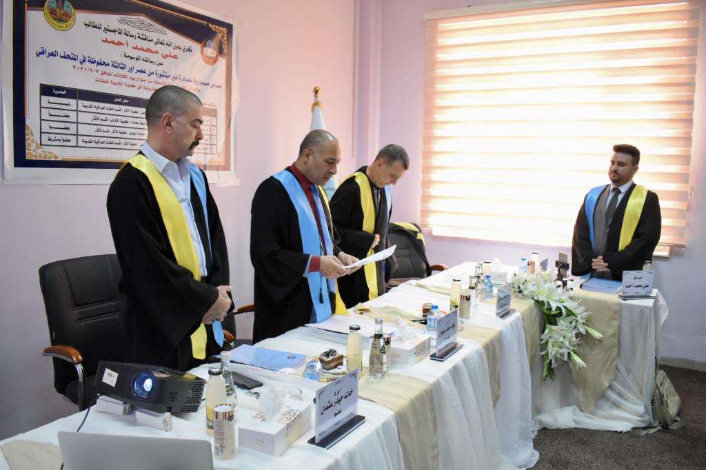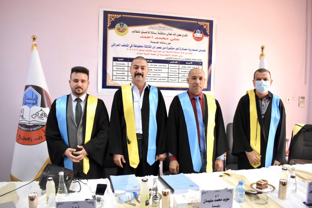 ناقش قسم اللغات العراقية القديمة في كلية الاثار رسالة ماجستير بعنوان نصوص مسمارية مصادرة غير منشورة من عصر أُور الثالثة محفوظة في المتحف العراقي ، صباح يوم الثلاثاء الموافق 7/9/2021 للطالب علي محمد احمد على القاعة الالكترونية في كلية التربية للبنات وتناول الدراسة ترجمة وتحليل (29) نصا مسماريا تعود الى عصر اور الثالثة وتحديدا المدة الواقعة بين (2066- 2027 ق. م) وقد تنوعت مضامين هذه النصوص إذ شملت نصين متعلقين برعاة الثيران، ونصوص متعلقة بالمبعوثين الملكين وتفاصيل رحلاتهم ومؤنهم، وكذلك اشتملت نصوص الدراسة الاُخرى على مضامين متفرقة منها (أُحجار ومعادن، جراية صوف، أُسماء أَشخاص…الخ)، وبناءً علىٰ مقارنة نصوص الدراسة مع نصوص مسمارية مصادرة منشورة، وهي تعود لمقتنيات المتحف العراقي أو متحف السليمانية أو ضمن مجموعات محفوظة في متاحف عالمية وجدنا تشابهاً واضحاً في الأساليب والتواريخ، وتألفت لجنة المناقشة كلا منا.د. مؤيد محمد سليمان رئيسا