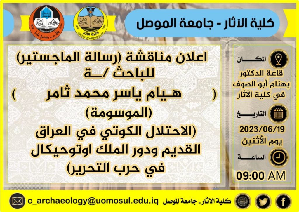 موعد مناقشة رسالة الماجستير الموسومة (الاحتلال الكوتي في العراق القديم ودور الملك اوتوحيكال في حرب التحرير)