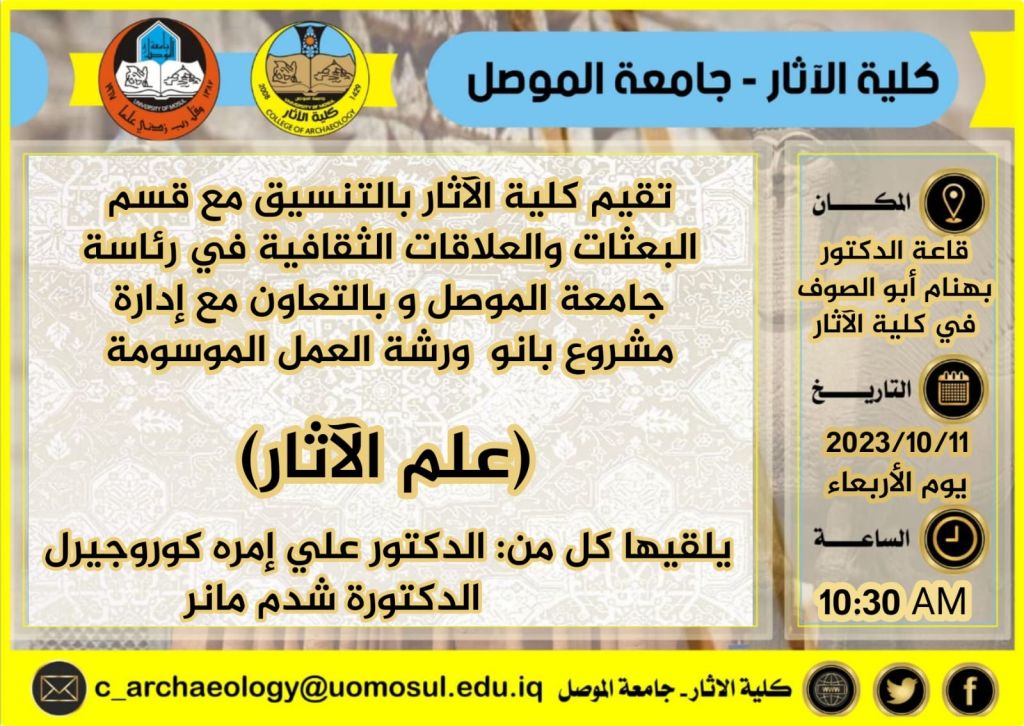 أقامت كلية الاثار وبالتنسيق مع قسم البعثات والعلاقات الثقافية في رئاسة جامعة الموصل وبالتعاون مع ادارة مشروع بانو يوم الاربعاء الموافق 11/10/2023 ورشة عمل بعنوان ( علم الاثار ) القاها الدكتور (علي إمره ) من جامعة كوتش التركية .