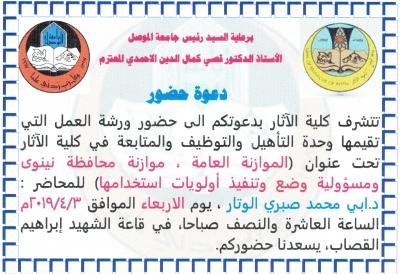 برعاية الأستاذ الدكتور قصي كمال الدين الأحمدي المحترم رئيس جامعة الموصل وبأشراف الأستاذ الدكتور حسين ظاهر حمود و. عميد كلية الآثار المحترم تقيم وحدة التأهيل والتوظيف والمتابعة في كلية الآثار ورشة عمل تحت عنوان (الموازنة العامة ، موازنة محافظة نينوى ومسؤولية وضع وتنفيذ أولويات استخدامها) يلقيها المحاضر د. أُبي محمد صبري الوتار يوم الأربعاء الموافق 3/4/2019 الساعة العاشرة والنصف صباحاً على قاعة الشهيد إبراهيم القصاب في كلية التربية للعلوم الإنسانية