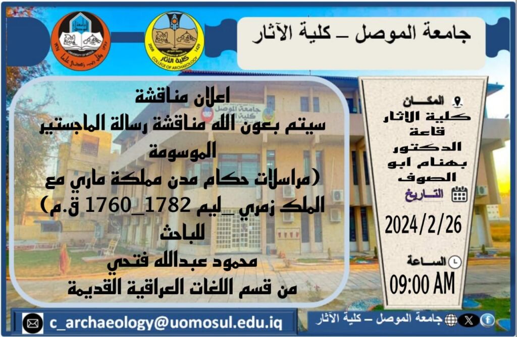 اقام قسم اللغات العراقية القديمة في كلية الآثار جامعة الموصل حلقة نقاشية بعنوان (العلامات المسمارية المائلة tenû) يوم الخميس 22 شباط ٢٠٢٤ القاها الاستاذ المساعد الدكتور ( احمد ميسر فاضل ) حضر جانب منها الاستاذ المساعد الدكتور ياسر جابر خليل معاون العميد للشؤون العلمية والمدرس المساعد خالص عبدالكريم فرمان معاون العميد للشؤون الإدارية والاستاذ المساعد الدكتور معاذ حبش خضر رئيس قسم اللغات العراقية القديمة وعدد من تدريسيي الكلية وذلك في قاعة الدكتور بهنام أبو الصوف في الكلية.