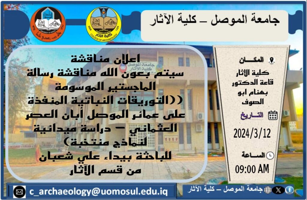 موعد مناقشة رسالة الماجستير الموسومة (التوريقات النباتية المنفذة على عمائر الموصل أبان العصر العثماني - دراسة ميدانية لنماذج منتخبة)