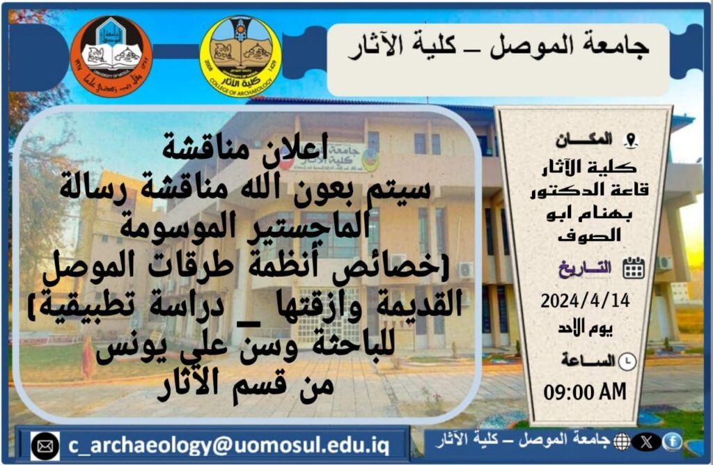 موعد مناقشة رسالة ماجستير في كلية الاثار بعنوان "خصائص انظمة طرقات الموصل القديمة وازقتها -دراسة تطبيقية"