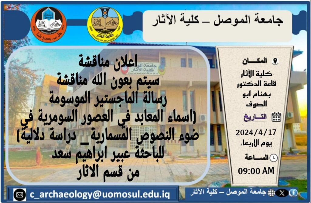 موعد مناقشة رسالة ماجستير في كلية الاثار بعنوان (اسماء المعابد في العصور السومرية في ضوء النصوص المسمارية -دراسة دلالية)