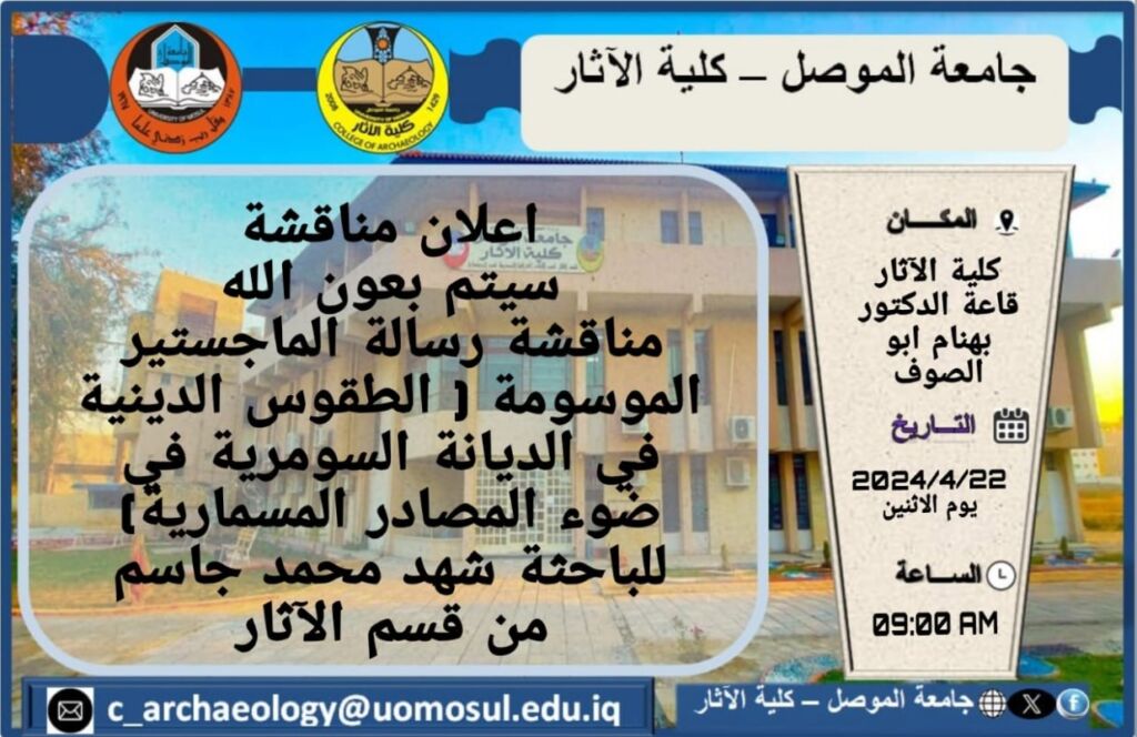 شارك كل من الاستاذ المساعد الدكتور معاذ حبش خضر رئيس قسم اللغات العراقية القديمة و الاستاذ المساعد الدكتور حسنين حيدر عبد الواحد من قسم اللغات العراقية القديمة في مناقشة اطروحة الدكتوراه للطالبة رواء انور عزيز رسام والموسومة “الانهار في شمال بلاد الرافدين في ضوء المشاهد الفنية والمصادر المسمارية خلال الالف الاول قبل الميلاد” في قسم الاثار /كلية الآداب/ جامعة صلاح الدين/اربيل وعلى قاعه فرهادي يوم الخميس الموافق 18 نيسان 2024 .