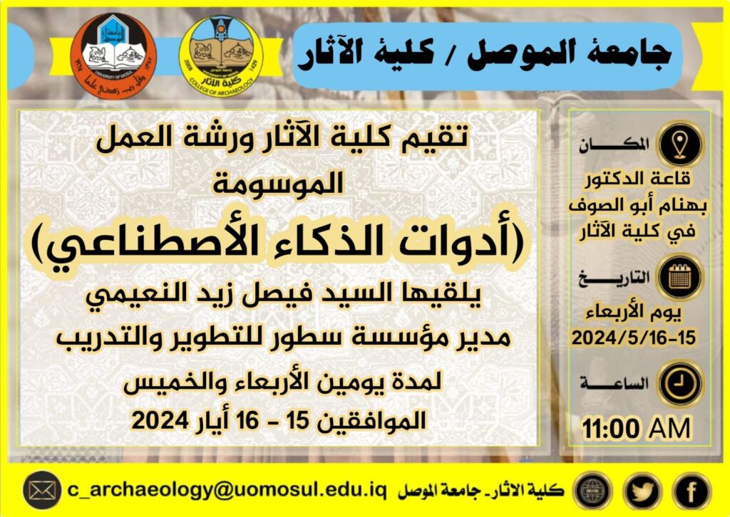 أقامت كلية الآثار/ جامعة الموصل ورشة العمل الموسومة “” العمل الآثاري الحديث في موقع لكش -تلول الهباء- في جنوب العراق” والتي ألقاها الدكتور (زيد إسماعيل الراوي) من جامعة بنسلفانيا الأمريكية وذلك يوم الاحد الموافق 12 أيار 2024 على قاعة الدكتور بهنام أبو الصوف