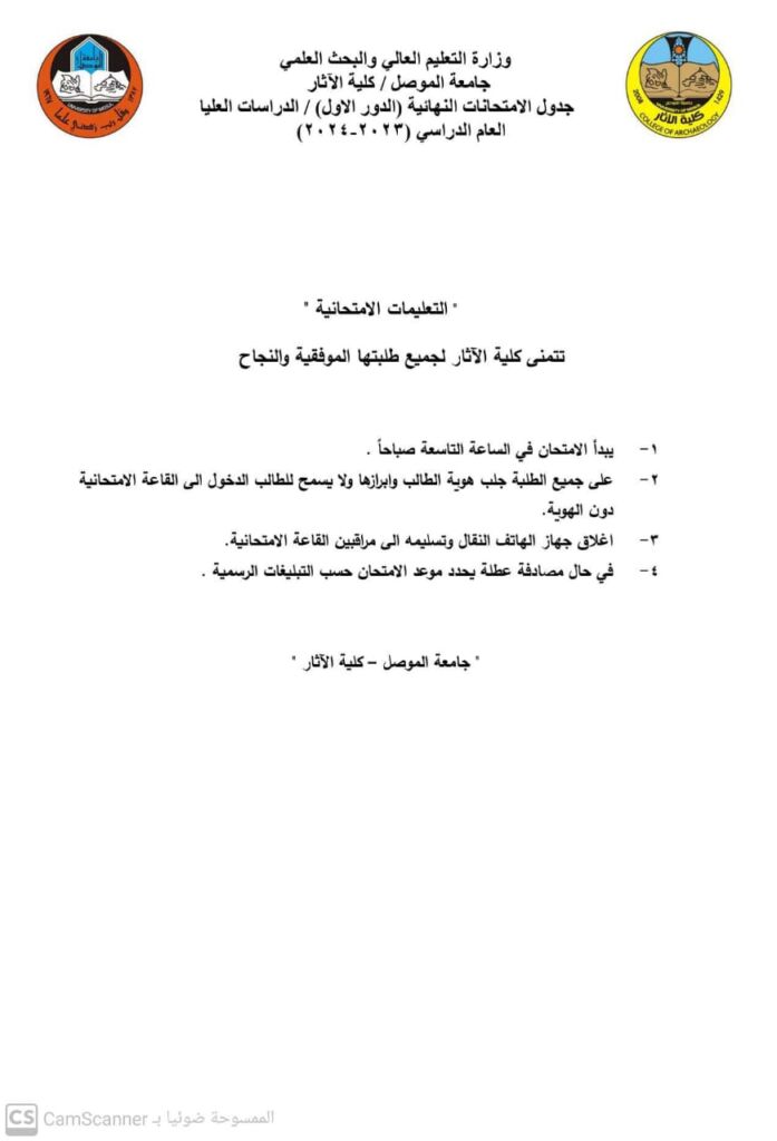 اعلان جداول الامتحانات النهائية /الدراسات العليا في كلية الآثار