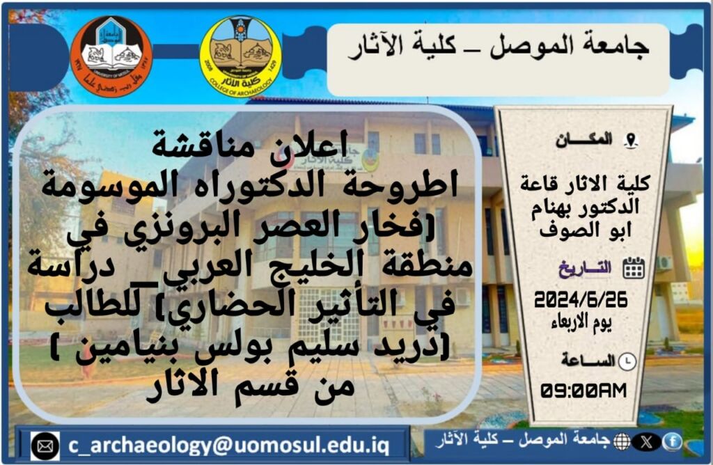 نوقش في قسم الآثار بكلية الآثار جامعة الموصل اطروحة الدكتوراه الموسومة “الفخار البرونزي في منطقة الخليج العربي- دراسة في التأثير الحضاري” وذلك في يوم الاربعاء الموافق 26/ حزيران/2024. وعلى قاعة الدكتور بهنام أبو الصوف.