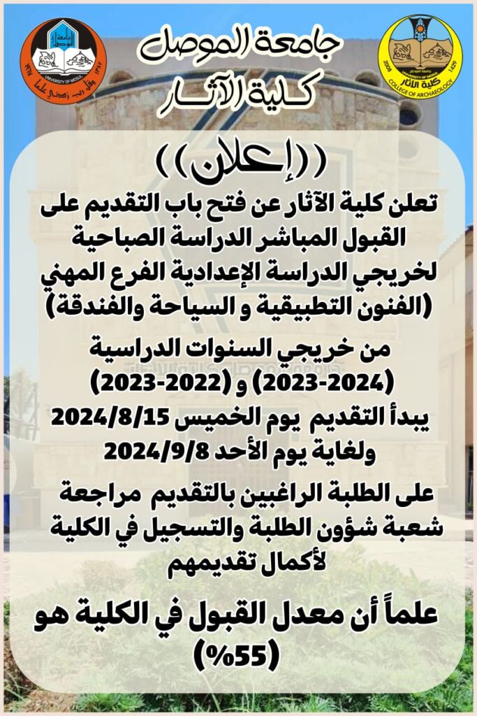 اعلان عن فتح باب التقديم على القبول المباشر الدراسة الصباحية في كلية الآثار