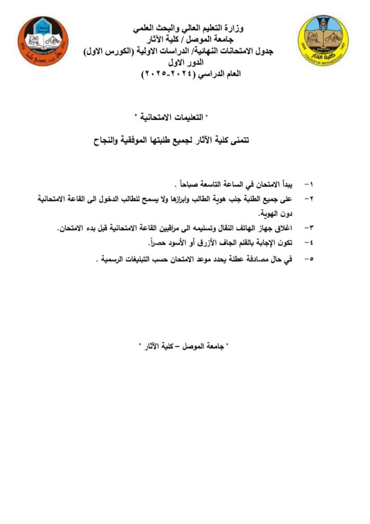جدول الامتحانات النهائية للدراسات الاولية / الكورس الاول (الدور الاول) لأقسام كلية الآثار في جامعة الموصل