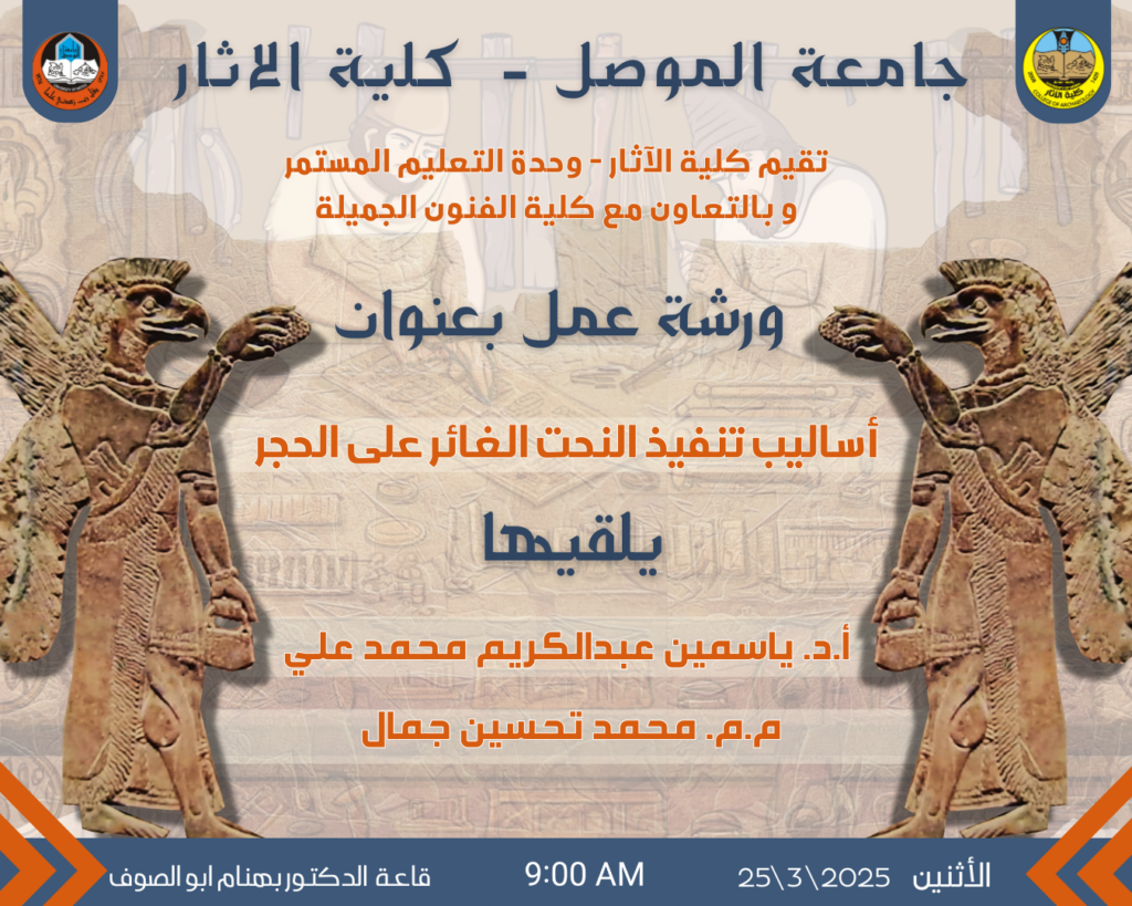وتناولت الورشة جانبين الأول نظري في كلية الآثار ألقته الأستاذ الدكتور ياسمين عبد الكريم محمد علي وتناولت فيه أساليب النحت الغائر والبارز وكيفية تنفيذ هذا النحت من قبل سكان بلاد الرافدين قديما وكذلك طرق تثبيت الألواح المنحوتة على الجدران اما الجانب الثاني وهو العملي فكان من نصيب المدرس المساعد محمد تحسين من كلية الفنون الجميلة إذ تناول في ورشته شرح للأدوات والمواد المستخدمة في أعمال النحت وقد تطرق إلى المواد الأولية في النحت وهي المرمر والحان وبعض أنواع من الصخور