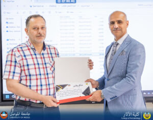 وحضر جانبا من الدورة  الأستاذ الدكتور ياسمين عبد الكريم محمد علي عميد الكلية والدكتور ياسر جابر معاون العميد للشؤون العلمية واستمرت الدورة ثلاث أيام ابتدأ من 26 – 28 آيار 2025 تضمن اليوم الأول من الدورة تصميم مخرجات التعلم القياسية المقررات الدراسية فيما تضمن اليوم الثاني تصميم مخرجات التعلم القياسية للبرنامج الأكاديمي أما اليوم الثالث فقد شمل التدريب على تحقيق وقياس مخرجات التعلم.. وفي ختام الدورة سلم الدكتور ياسر جابر معاون العميد للشؤون العلمية شهادة تقدير للأستاذ المحاضر