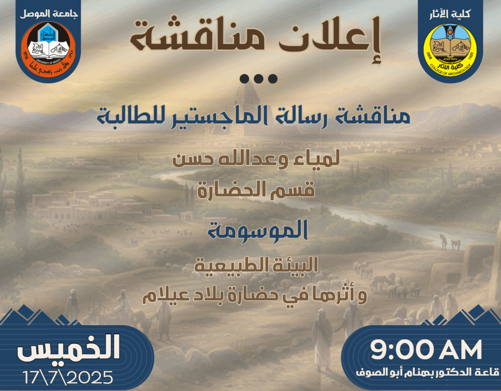 تمت مناقشة رسالة الماجستير الموسومة : (البيئة الطبيعية وأثرها في حضارة بلاد عيلام) للطالبة (لمياء  وعدالله حسن) من قسم الحضارة اليوم الخميس 17 تموز 2025 وعلى قاعة الدكتور بهنام أبو الصوف اذ تناولت الرسالة دراسة العلاقة بين البيئة الطبيعية بلاد عيلام وبين الانسان وكل ما ورد عن عيلام حول تلك البيئة فضلاً عن كل ما حملته من اهمية تاريخية