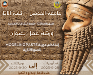 تقيم كلية الاثار شعبة النشاطات الطلابية ورشة عمل الموسومة (( أستخدام عجينة MODELIG PASTE للصور الآثرية )) للمدة من يوم الاحد 28 أيلول ولغاية 30 أيلول وعلى قاعة الابداع والتميز في الكلية … تبدأ الدورة في الساعة 9:30