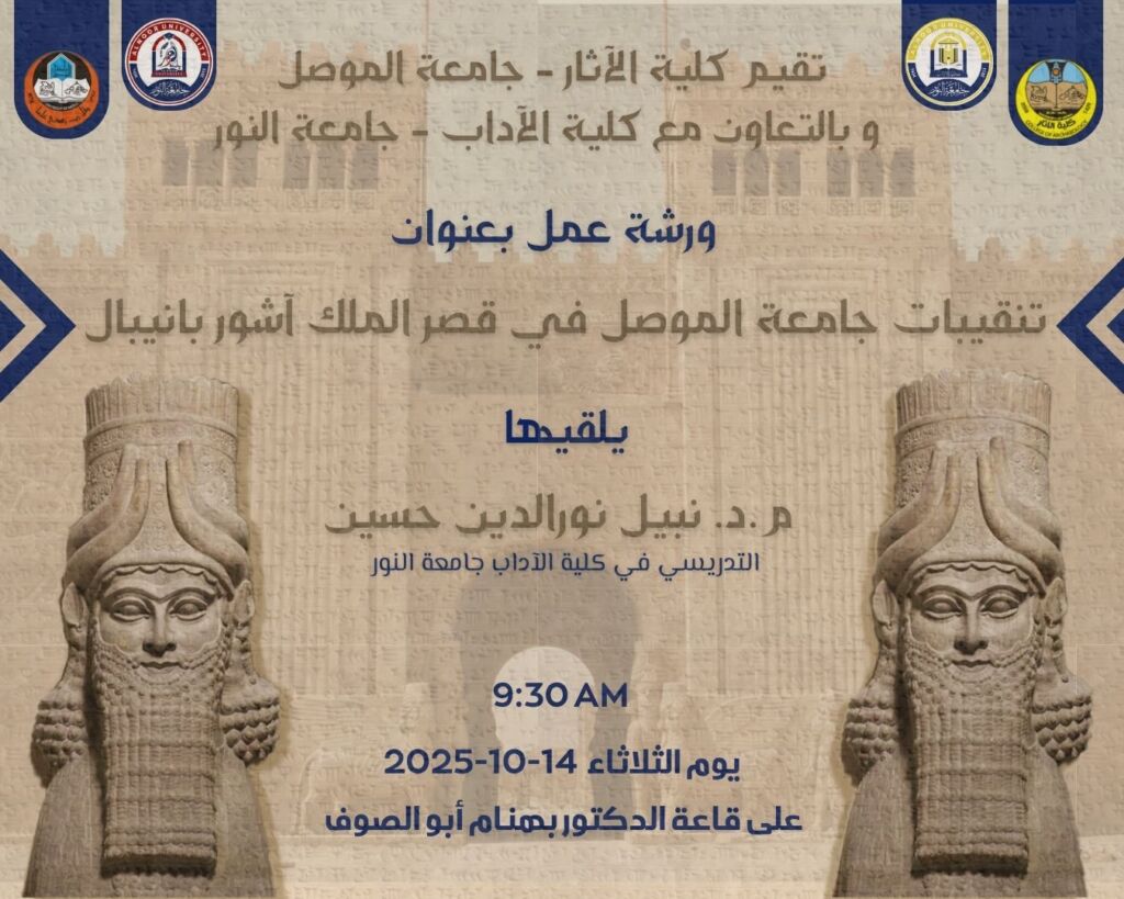 تنفيذًا لتوجيهات وزارة التعليم العالي والبحث العلمي، زارت لجنة وزارية كلية الآثار جامعة الموصل يوم الاحد 12 تشرين الاول ٢٠٢٥ وكان في استقبال الوفد معاون العميد للشؤون العلمية أ.م.د. ياسر جابر خليل ورئيس قسم اللغات العراقية القديمة أ.م.د. معاذ حبش خضر
