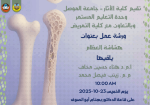 تقيم كلية الاثار بالتعاون مع كلية التمريض ورشة عمل بعنوان (هشاشة العظام) يلقيها ا.م.د. هناء حسين مخلف وم.م. زينب فيصل محمد يوم الخميس 23 تشرين الاول 2025 وعلى قاعة الدكتور بهنام أبو الصوف