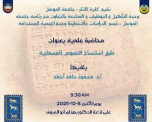 تقيم كلية الاثار وحدة التأهيل والتوظيف وبالتعاون مع رئاسة جامعة الموصل قسم الدراسات والتخطيط وحدة التنمية المستدامة محاضرة علمية بعنوان (طرق استنساخ النصوص المسمارية) يلقيها الاستاذ الدكتور محمود حامد احمد يوم الاثنين 8 كانون الاول 2025 على قاعة الدكتور بهنام أبو الصوف