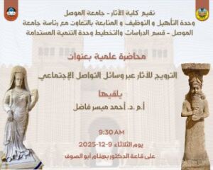 تقيم كلية الاثار وحدة التأهيل والتوظيف وبالتعاون مع رئاسة جامعة الموصل قسم الدراسات والتخطيط وحدة التنمية المستدامة محاضرة علمية بعنوان ( الترويج للاثار عبر وسائل التواصل الاجتماعي) يلقيها الاستاذ المساعد الدكتور احمد ميسر فاضل يوم الثلاثاء 9 كانون الاول 2025 على قاعة الدكتور بهنام أبو الصوف