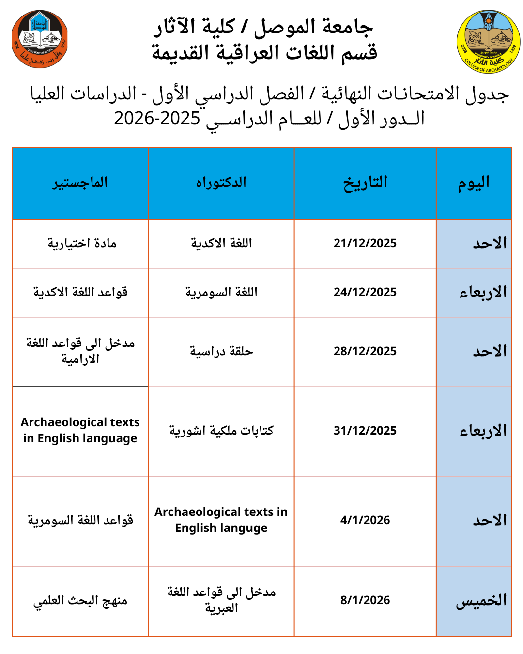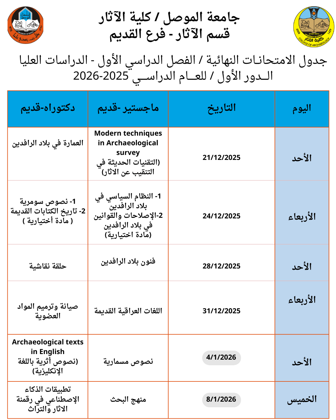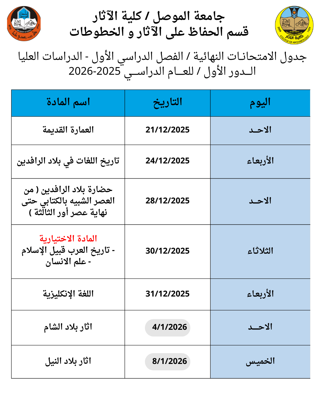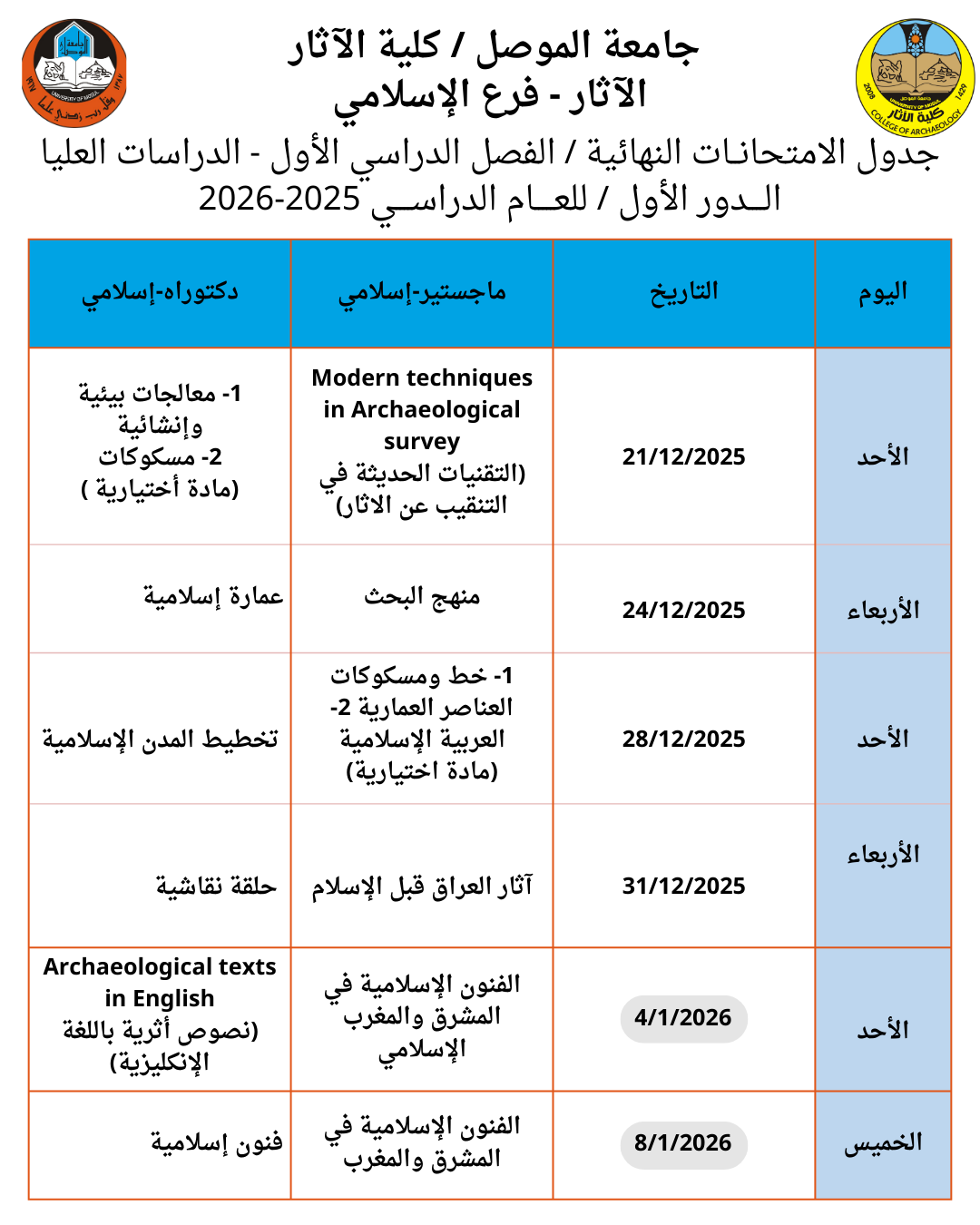 جدول امتحانات الدراسات العليا للعام الدراسي 2025-2026 الكورس الاول