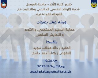 odayabdulwaheb2025-11-02T22:54:54+03:00تقيم شعبة الإرشاد النفسي الجامعي بالتعاون مع الشرطة المجتمعية ورشة العمل الموسومة (حماية النسيج المجتمعي والتنوع والتعايش السلمي) يوم الاثنين 3 تشرين الثاني 2025 الساعة التاسعة والنصف وعلى قاعة الدكتور بهنام أبو الصوف.