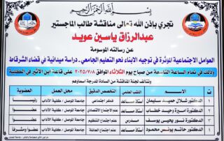 على الطلبة المتقدمين للدراسات العليا للعام الدراسي ٢٠٢٤ - ٢٠٢٥ من الذين لم تصلهم الاستمارة المدققة ولم يسلموا الفايل ورقي يرجى مراجعة شعبة الدراسات العليا [إقرأ المزيد]