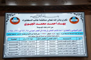 الدور السياسي والحضاري لعلماء المذهب الحنفي في بغداد في العصر العباسي(248-656ه/862-1258م)، وذلك يوم الأربعاء ١٧ أيلول ٢٠٢٥ حضر جانبا منها رئيس القسم الدكتور محمود صالح سعيد وعدد من تدريسيي الكلية.
