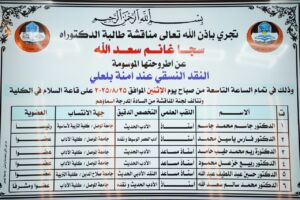 ناقش قسم اللغة العربية في كلية الآداب أطروحة دكتوراه عن النقد النسقي عند آمنة بلعلي وذلك يوم الاثنين ٢٥ آب ٢٠٢٥ حضر جانباً منها الأستاذ الدكتور حاتم فهد الطائي عميد الكلية ورئيس القسم الدكتور أحمد صالح المولى وعدد من تدريسيي الكلية.