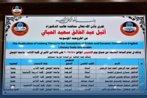 تطبيق نظرية الجبل الجليدي في ترجمة العناصر الثابتة والمتحركة في النصوص الأدبية الانجليزية الى اللغة العربية، وذلك يوم الخميس 08 آيار 2025، حضر جانبا منها الأستاذ الدكتور حاتم فهد هنو عميد الكلية ورئيس القسم الدكتورة هالة خالد نجم وعدد من تدريسيي الكلية.