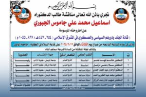 ناقش قسم التاريخ في كلية الآداب أطروحة دكتوراه بعنوان: ” قادة الجند ودورهم السياسي والعسكري في المشرق الإسلامي (٢٥٤ – ٤٤٧هــ / ٨٦٧ – ١٠٥٥م ” ، يوم الثلاثاء ١٧ حزيران ٢٠٢٥ حضر جانباً منها رئيس القسم الدكتور محمود صالح سعيد وعدد من تدريسيي الكلية.
