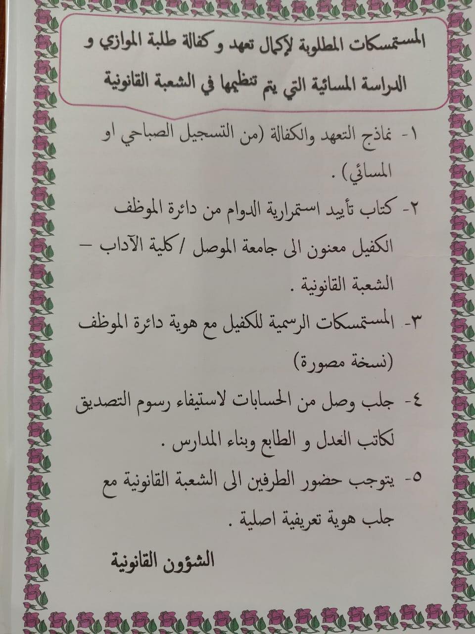 تودّ كلية الآداب إعلام الطلبة المقبولين في الدراسة المسائية و الدراسة الموازي بضرورة استكمال إجراءات التعهّد والكفالة القانونية وفق الضوابط المعتمدة، وذلك من خلال تقديم المستمسكات التالية :