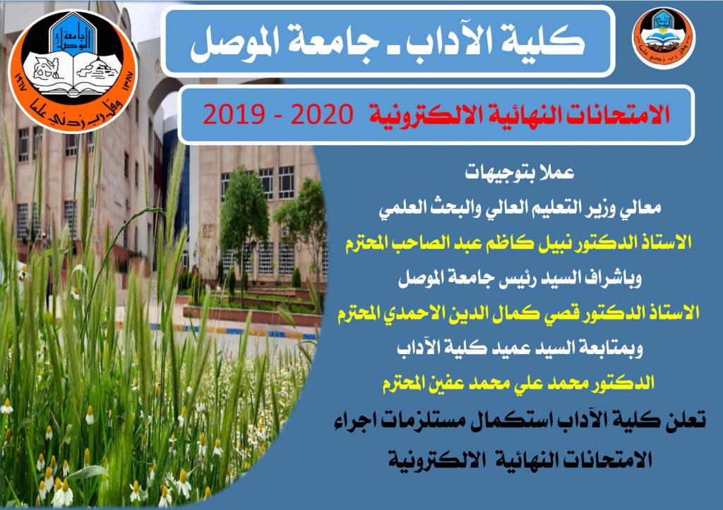 عملا بتوجيهات معالي وزير التعليم العالي والبحث العلمي الاستاذ الدكتور نبيل كاظم عبد الصاحب المحترموباشراف السيد رئيس جامعة الموصل الاستاذ الدكتور قصي كمال الدين الاحمدي المحترموبمتابعة السيد عميد كلية الآداب الدكتور محمد علي محمد عفين المحترمتعلن كلية الآداب ممثلة بكادرها العلمي العريق استكمال مستلزمات إجراء الامتحانات النهائية الإلكترونية للعام الدراسي ٢٠١٩-٢٠٢٠.ونحن إذ نعلن جهوزيتنا لخوض تحد علمي جديد فقد انبثقت عن التحضيرات والاستعدادات لكلية الآداب لاداء الامتحانات الكترونيا لجان امتحانية لها خبرة الكترونية عملت على ايجاد منصات امتحانية مناسبة على وفق التوجيهات والتوصيات التي قدمتها رئاسة جامعة الموصل ، كما عملت على اعداد وترتيب الكوادر التدريسية لتكون جاهزة على اداء الامتحانات في وقتها المحدد فضلا عن اداء اختبارات تجريبية للطلبة تسبق الامتحانات المقررة ، وتأتي هذه التجربة تجربة الامتحانات الإلكترونية لتعلن بداية عصر عليمي جديد قائم على العلمية والتكنولوجيا مع الظرف الاستثنائي الصعب الذي يتطلب من الجميع تسجيل موقفا وطنيا للمضي بأبنائنا الطلبة إلى النجاح والتخرج وإسعاد عوائلهم بمستقبل وأمل نتحدى فيه كل الصعاب…. نتمنى لطلبتنا في أقسام الكلية التوفيق والنجاح وحمى الله العراق أرضا وشعبا ، ومن الله السداد والتوفيق .