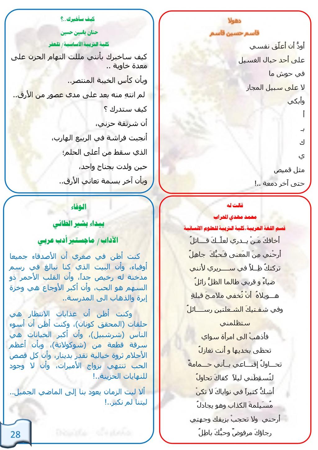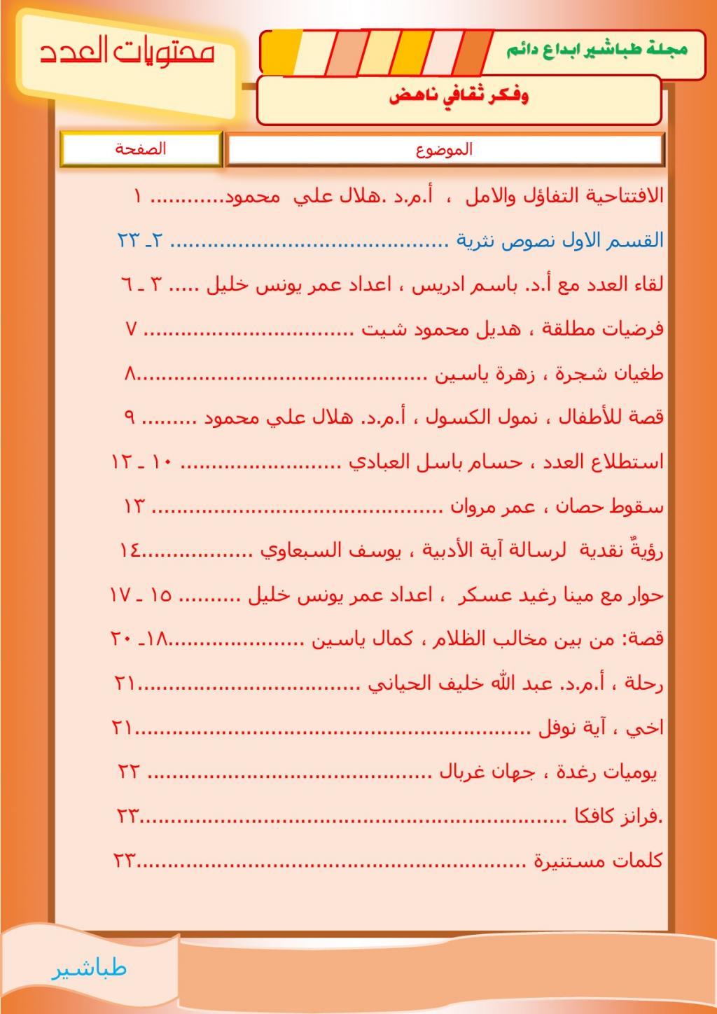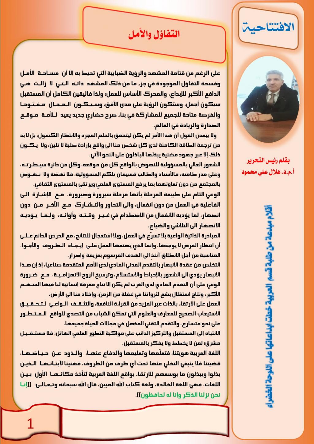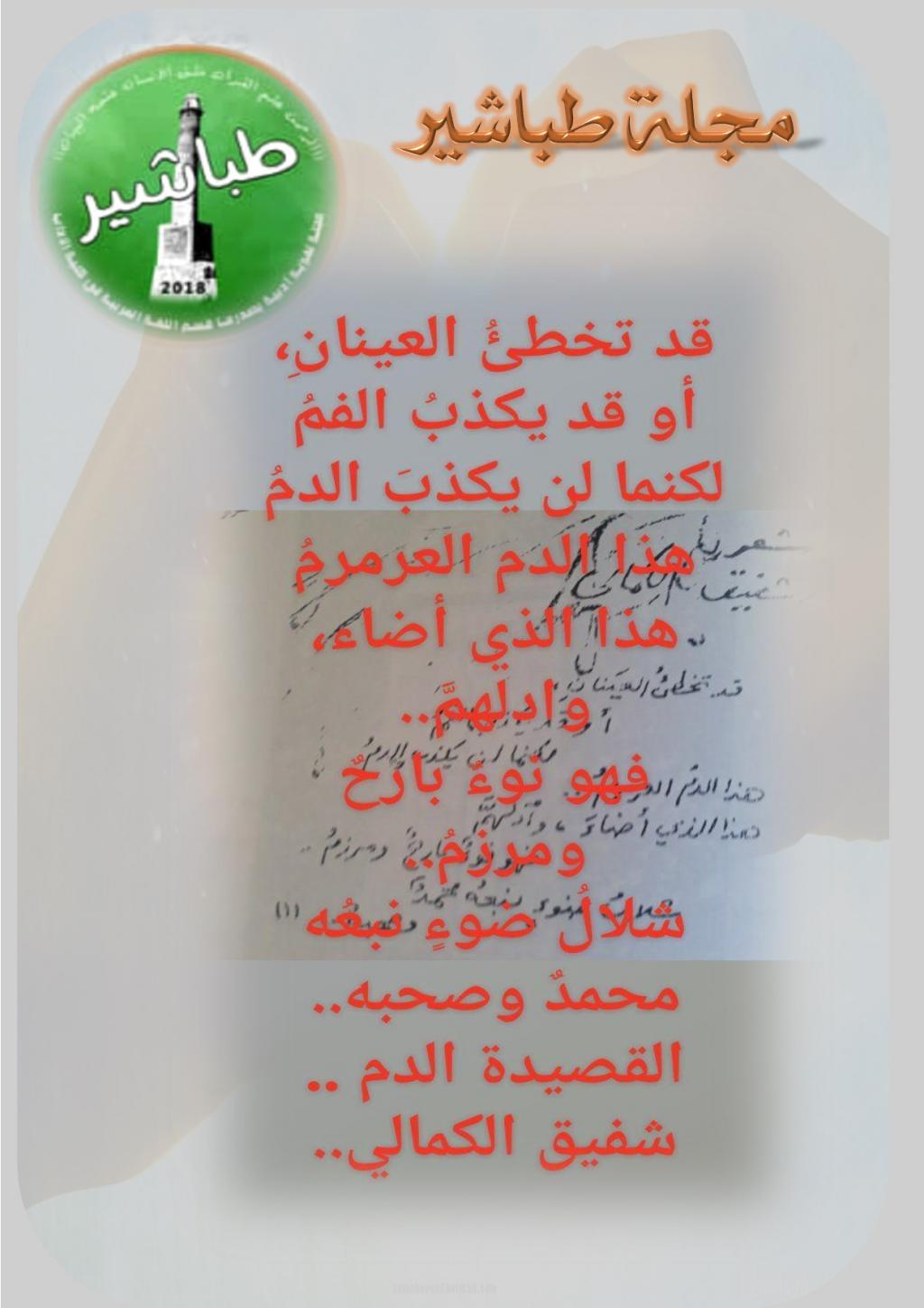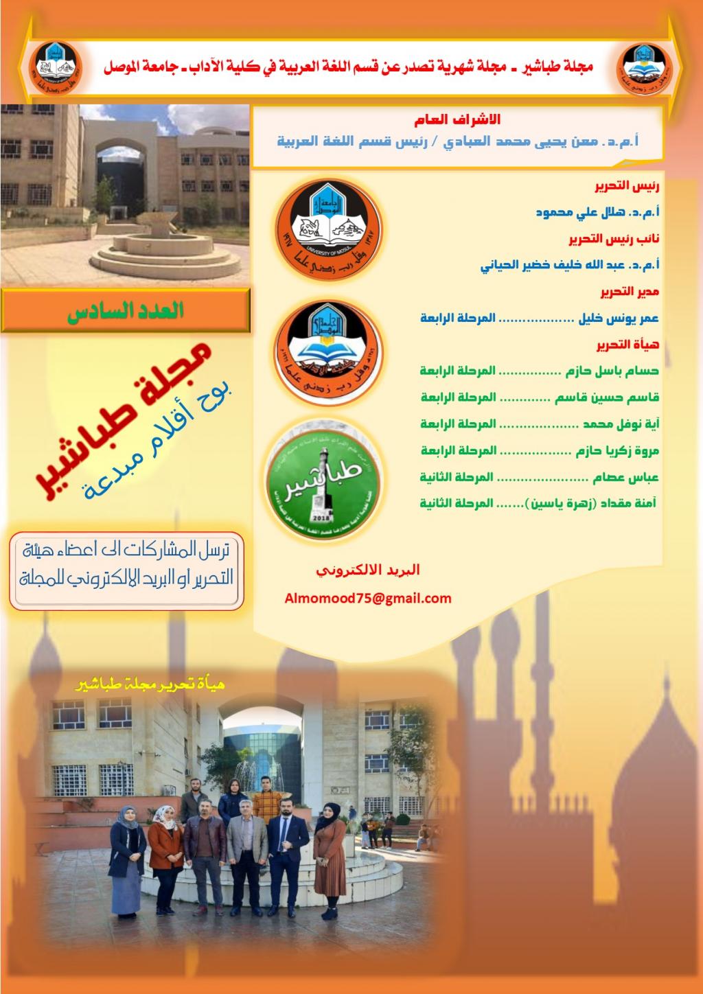 على بركة الله تعالى وتوفيق من عنده سبحانه، نضع بين أيديكم الكريمة العدد السادس من مجلة طباشير التي يصدرها قسم اللغة العربية في كلية الآداب، جامعة الموصل بوصفها جزءا من النشاطات العلمية والمعرفية التي تنقل المعطيات العلمية والمعرفية من حيز التنظير والمشافهة إلى التطبيق والمداولة، بإشراف السيد عميد كلية الآداب أ.م.د.محمد علي عفين وبمتابعة السيد رئيس القسم أ.م.د. معن يحيى محمد العباديوباسم السيد عميد كلية الآداب ومنتسبيها نهدي هذا المنجز المعرفي والثقافي والعلمي الى السيد رئيس جامعة الموصل الاستاذ الدكتور قصي كمال الدين الاحمدي والى جامعتنا العريقة جامعة الموصلمجلة طباشير واهدافها هي مجلة ادبية لغوية تصدر شهريا عن قسم اللغة العربية تهدف المجلة الى تدريب الطلبة واكتشاف مهاراتهم الابداعية من نثر او شعر وتعمل على صقل خبراتهم ، وهذا ما حققته المجلة من فوز عدد كبير من اعضائها في مسابقة الفنون الابداعية لجامعة الموصل ، وكذلك استطاع عدد اخر من طباعة دواوينه الشعريةمكانة المجلةلاقت المجلة قبولا واسعا من التدريسيين والطلبة في اللغة العربية واستطاعت الانتشار الى رقعة جغرافية واسعة من باحة كلية الآداب وباحات جامعة الموصل الى المحافظات العراقية إذ نجد مشاركات عدة من محافظات عراقية ولم تكتف بذلك بل انطلقت الى دول عربية اذ نجد مشاركات عربية من تونس والجزائر والسعودية ؛ وبذلك حققت المجلة جسرا معرفيا وثقافيا وعلميا يحمل اسم جامعة الموصل بقيادتها الرشيدة المتمثلة بالسيد رئيس جامعة الموصل الاستاذ الدكتور قصي كمال الدين الاحمدي ، وادارة كلية الآداب ممثلة بعميدها الدكتور محمد علي عفيناعضاء المجلةرئيس تحريرها الدكتور هلال علي محمود ، ونائب رئيس التحرير الدكتور عبد االله خليف خضير الحياني ، اما بقية الاعضاء فهم من الطلبة المبدعين من كلية الآداب قسم اللغة العربية وهم كل من : مدير التحرير عمر يونس خليل ، المرحلة الرابعة ، وفي هيئة التحرير : حسام باسل حازم ، المرحلة الرابعة، وقاسم حسين قاسم ، المرحلة الرابعة ، وآية نوفل محمد ، المرحلة الرابعة، ومروة زكريا حازم ، المرحلة الرابعة، وعباس عصام ، المرحلة الثانية ، وآمنة مقداد (زهرة ياسين)، المرحلة الثانية