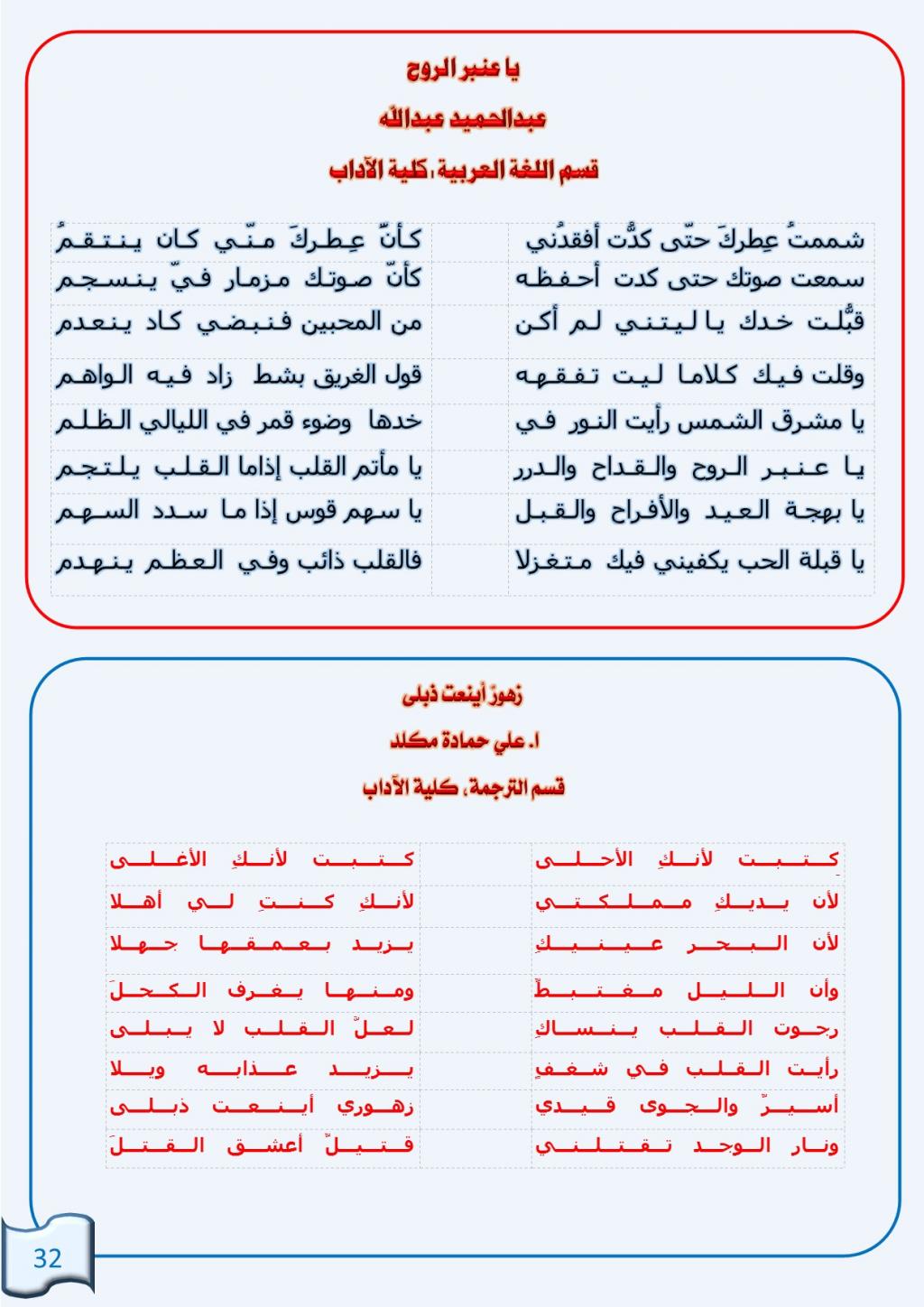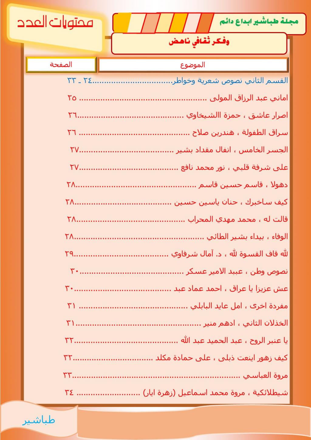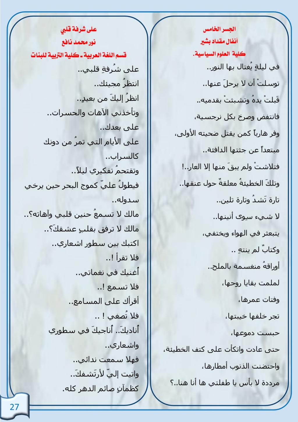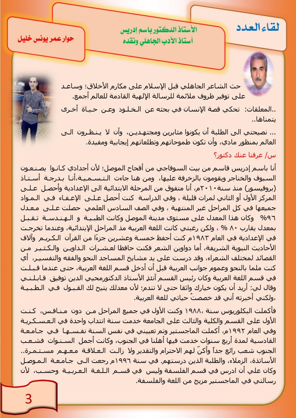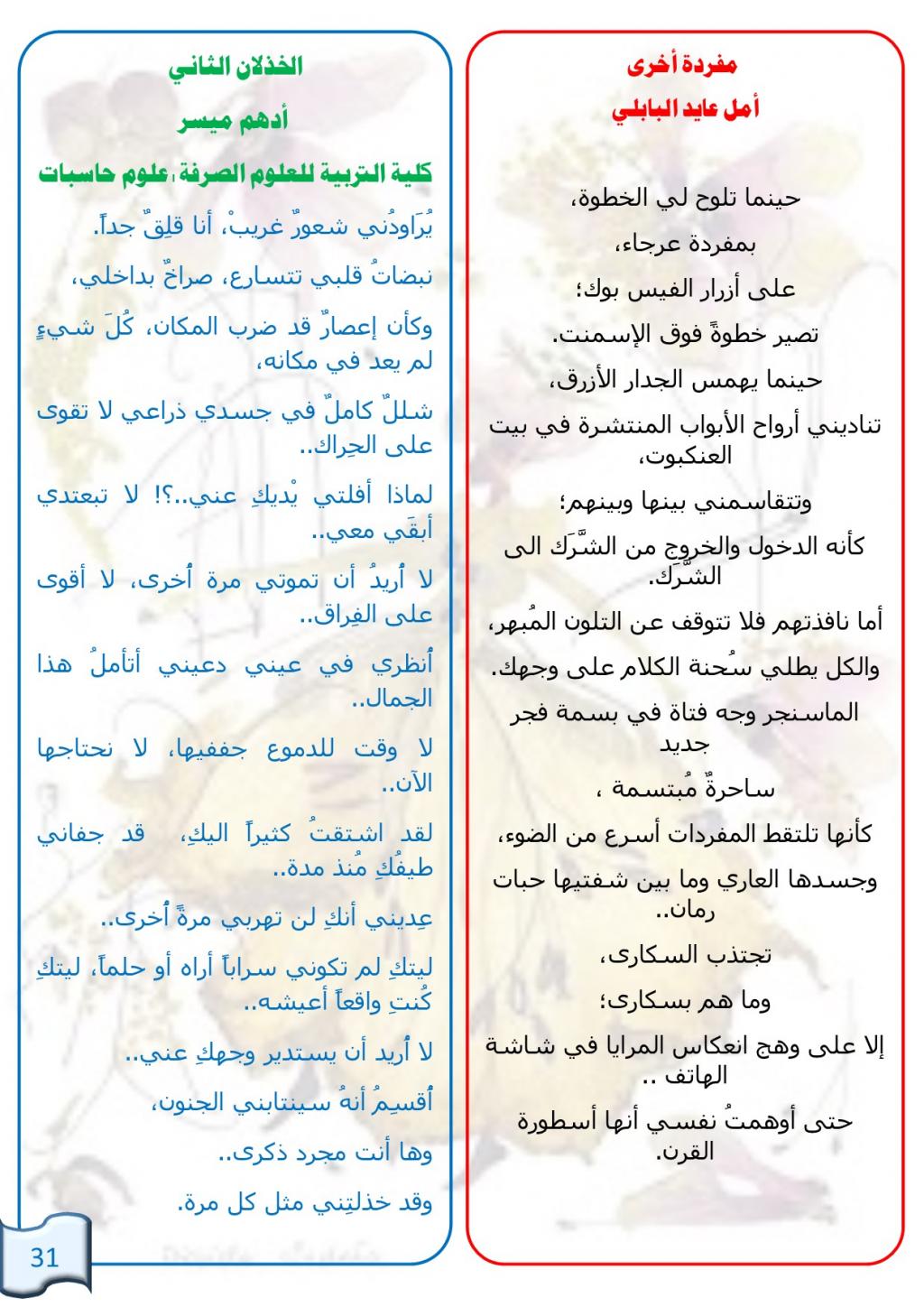 على بركة الله تعالى وتوفيق من عنده سبحانه، نضع بين أيديكم الكريمة العدد السادس من مجلة طباشير التي يصدرها قسم اللغة العربية في كلية الآداب، جامعة الموصل بوصفها جزءا من النشاطات العلمية والمعرفية التي تنقل المعطيات العلمية والمعرفية من حيز التنظير والمشافهة إلى التطبيق والمداولة، بإشراف السيد عميد كلية الآداب أ.م.د.محمد علي عفين وبمتابعة السيد رئيس القسم أ.م.د. معن يحيى محمد العباديوباسم السيد عميد كلية الآداب ومنتسبيها نهدي هذا المنجز المعرفي والثقافي والعلمي الى السيد رئيس جامعة الموصل الاستاذ الدكتور قصي كمال الدين الاحمدي والى جامعتنا العريقة جامعة الموصلمجلة طباشير واهدافها هي مجلة ادبية لغوية تصدر شهريا عن قسم اللغة العربية تهدف المجلة الى تدريب الطلبة واكتشاف مهاراتهم الابداعية من نثر او شعر وتعمل على صقل خبراتهم ، وهذا ما حققته المجلة من فوز عدد كبير من اعضائها في مسابقة الفنون الابداعية لجامعة الموصل ، وكذلك استطاع عدد اخر من طباعة دواوينه الشعريةمكانة المجلةلاقت المجلة قبولا واسعا من التدريسيين والطلبة في اللغة العربية واستطاعت الانتشار الى رقعة جغرافية واسعة من باحة كلية الآداب وباحات جامعة الموصل الى المحافظات العراقية إذ نجد مشاركات عدة من محافظات عراقية ولم تكتف بذلك بل انطلقت الى دول عربية اذ نجد مشاركات عربية من تونس والجزائر والسعودية ؛ وبذلك حققت المجلة جسرا معرفيا وثقافيا وعلميا يحمل اسم جامعة الموصل بقيادتها الرشيدة المتمثلة بالسيد رئيس جامعة الموصل الاستاذ الدكتور قصي كمال الدين الاحمدي ، وادارة كلية الآداب ممثلة بعميدها الدكتور محمد علي عفيناعضاء المجلةرئيس تحريرها الدكتور هلال علي محمود ، ونائب رئيس التحرير الدكتور عبد االله خليف خضير الحياني ، اما بقية الاعضاء فهم من الطلبة المبدعين من كلية الآداب قسم اللغة العربية وهم كل من : مدير التحرير عمر يونس خليل ، المرحلة الرابعة ، وفي هيئة التحرير : حسام باسل حازم ، المرحلة الرابعة، وقاسم حسين قاسم ، المرحلة الرابعة ، وآية نوفل محمد ، المرحلة الرابعة، ومروة زكريا حازم ، المرحلة الرابعة، وعباس عصام ، المرحلة الثانية ، وآمنة مقداد (زهرة ياسين)، المرحلة الثانية