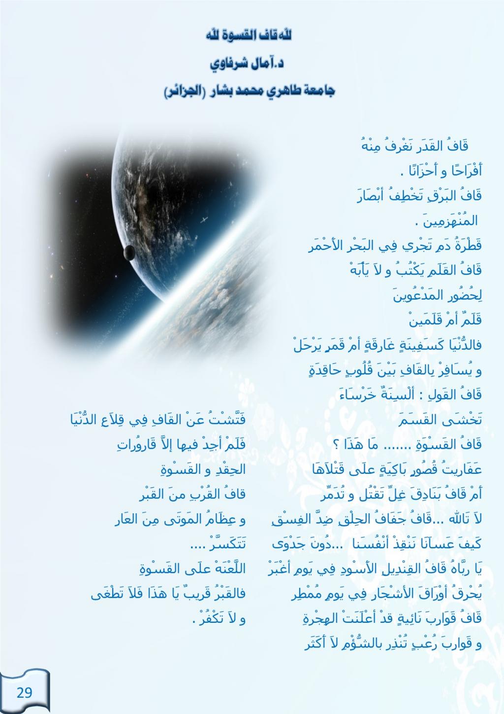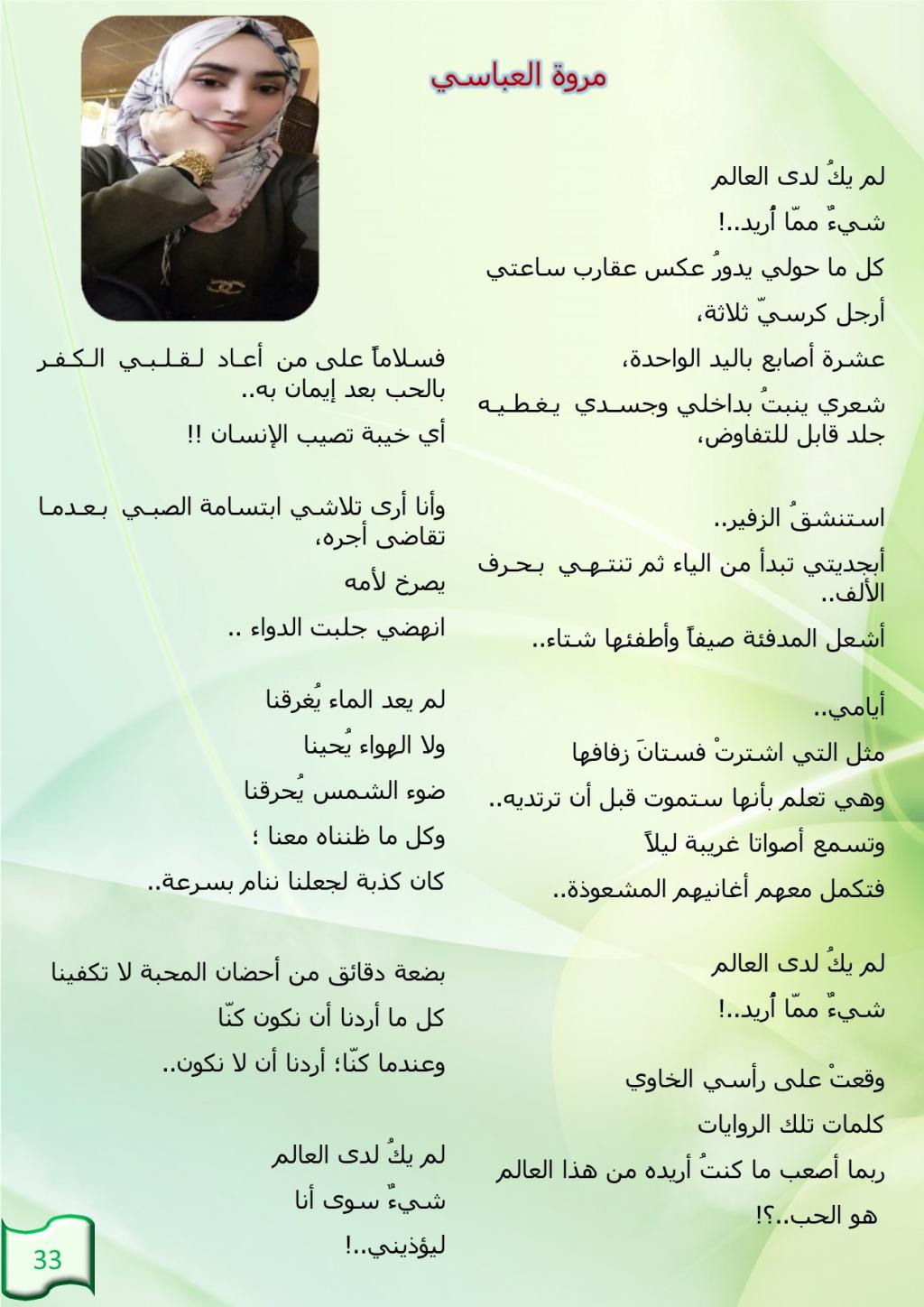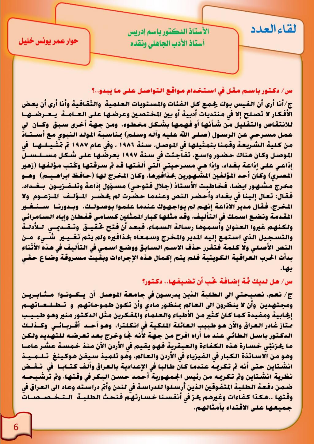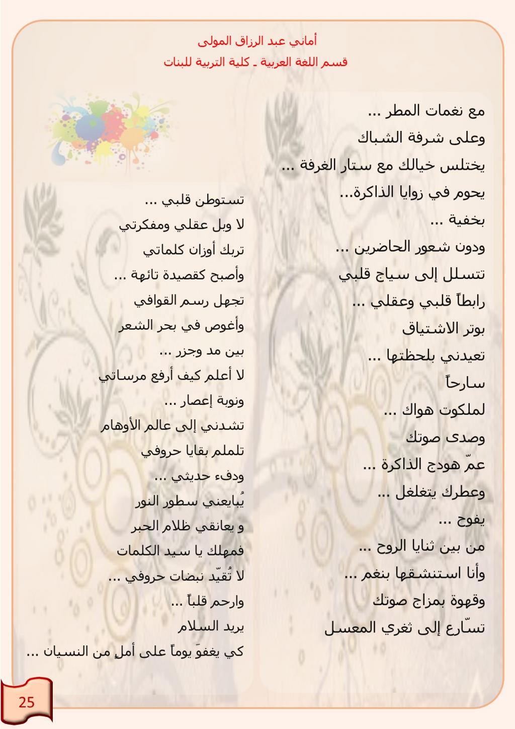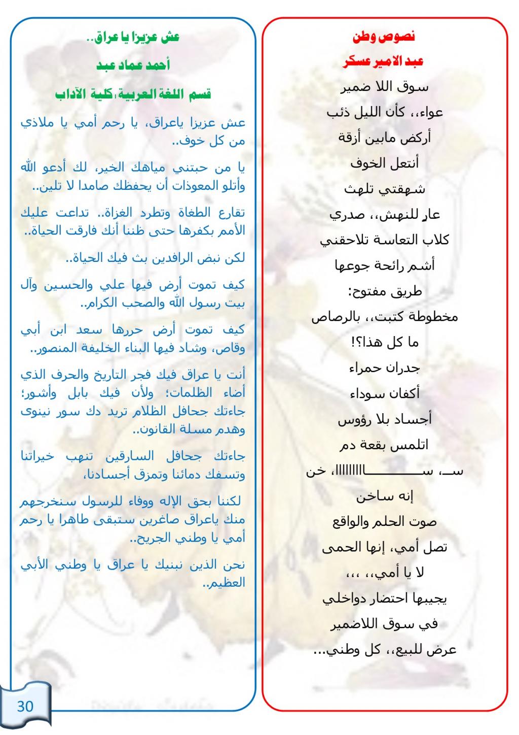 على بركة الله تعالى وتوفيق من عنده سبحانه، نضع بين أيديكم الكريمة العدد السادس من مجلة طباشير التي يصدرها قسم اللغة العربية في كلية الآداب، جامعة الموصل بوصفها جزءا من النشاطات العلمية والمعرفية التي تنقل المعطيات العلمية والمعرفية من حيز التنظير والمشافهة إلى التطبيق والمداولة، بإشراف السيد عميد كلية الآداب أ.م.د.محمد علي عفين وبمتابعة السيد رئيس القسم أ.م.د. معن يحيى محمد العباديوباسم السيد عميد كلية الآداب ومنتسبيها نهدي هذا المنجز المعرفي والثقافي والعلمي الى السيد رئيس جامعة الموصل الاستاذ الدكتور قصي كمال الدين الاحمدي والى جامعتنا العريقة جامعة الموصلمجلة طباشير واهدافها هي مجلة ادبية لغوية تصدر شهريا عن قسم اللغة العربية تهدف المجلة الى تدريب الطلبة واكتشاف مهاراتهم الابداعية من نثر او شعر وتعمل على صقل خبراتهم ، وهذا ما حققته المجلة من فوز عدد كبير من اعضائها في مسابقة الفنون الابداعية لجامعة الموصل ، وكذلك استطاع عدد اخر من طباعة دواوينه الشعريةمكانة المجلةلاقت المجلة قبولا واسعا من التدريسيين والطلبة في اللغة العربية واستطاعت الانتشار الى رقعة جغرافية واسعة من باحة كلية الآداب وباحات جامعة الموصل الى المحافظات العراقية إذ نجد مشاركات عدة من محافظات عراقية ولم تكتف بذلك بل انطلقت الى دول عربية اذ نجد مشاركات عربية من تونس والجزائر والسعودية ؛ وبذلك حققت المجلة جسرا معرفيا وثقافيا وعلميا يحمل اسم جامعة الموصل بقيادتها الرشيدة المتمثلة بالسيد رئيس جامعة الموصل الاستاذ الدكتور قصي كمال الدين الاحمدي ، وادارة كلية الآداب ممثلة بعميدها الدكتور محمد علي عفيناعضاء المجلةرئيس تحريرها الدكتور هلال علي محمود ، ونائب رئيس التحرير الدكتور عبد االله خليف خضير الحياني ، اما بقية الاعضاء فهم من الطلبة المبدعين من كلية الآداب قسم اللغة العربية وهم كل من : مدير التحرير عمر يونس خليل ، المرحلة الرابعة ، وفي هيئة التحرير : حسام باسل حازم ، المرحلة الرابعة، وقاسم حسين قاسم ، المرحلة الرابعة ، وآية نوفل محمد ، المرحلة الرابعة، ومروة زكريا حازم ، المرحلة الرابعة، وعباس عصام ، المرحلة الثانية ، وآمنة مقداد (زهرة ياسين)، المرحلة الثانية