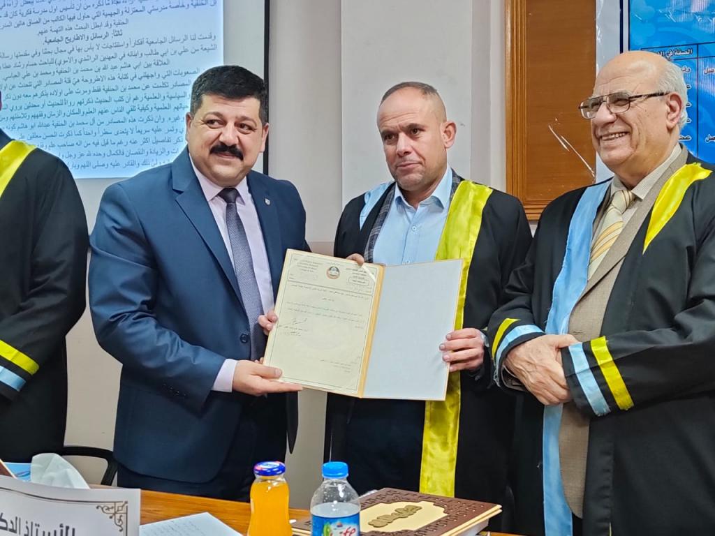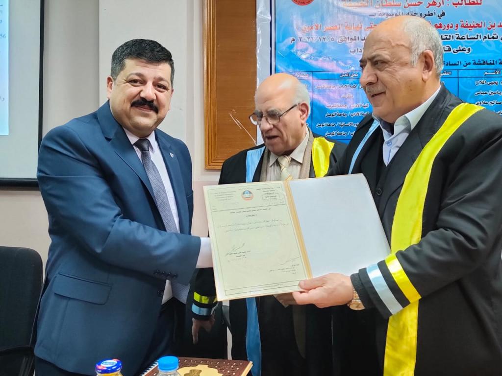 ناقش قسم التاريخ في كلية الآداب اطروحة دكتوراه بعنوان ” آل محمد بن الحنفية و دورهم في الحياة العامة حتى نهاية العصر الأموي،” يوم (الاحد) الموافق 05 كانون الاول 2021 في قاعة ابن الاثير لكلية الآداب، حضر جانبا منها السيد عميد كلية الآداب المحترم الدكتور محمد علي محمد عفين مع مجموعة من منتسبي و تدريسيي الكلية.تناولت الاطروحة التي تقدم بها الطالب (ازهر حسن سلطان) في قسم التأريخ، دور محمد بن الحنفية في الحرص الى عدم سفك الدماء حيث بقي محايداً طيلة فترة الصراعات.سلطت الدراسة الضوء على دور اولاد محمد بن الحنفية في الحفاظ على نهج والدهم فلم يخرجوا عن طاعته فبقوا معه يتنقلون من مكان لآخر.هدفت الدراسة الى توضيح دور آل محمد بن الحنفية في الحياة العامة حتى نهاية العصر الأموي وحرصهم على السلم والحفاظ على دماء المسلمين ومن يعيش في كنفهم من اهل الاديان الاخرى.ترأس لجنة المناقشة الاستاذ المتمرس الدكتور هاشم يحيى الملاح، وعضوية كل من الاستاذ الدكتور نجمان ياسين عباس و الاستاذ الدكتور طيب صالح علاوي من جامعة تكريت و الاستاذ الدكتور عبد القادر احمد يونس و الاستاذ المساعد الدكتور وليد مصطفى محمد من كلية التربية للعلوم الانسانية بجامعة الموصل، وبإشراف وعضوية الاستاذ الدكتور نايف محمد شبيب. و لقد اختتمت جلسة المناقشة بتكريم المناقشين الخارجيين من قبل السيد عميد كلية الآداب.