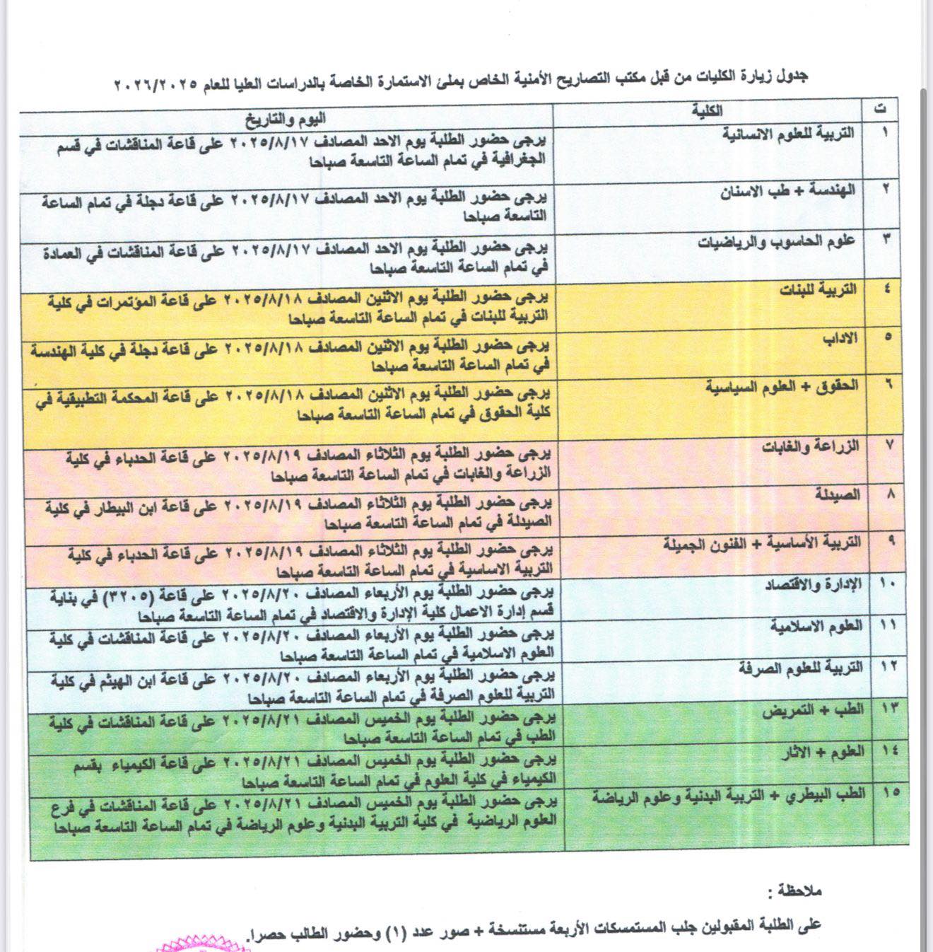 على كافة طلبة الدراسات العليا المقبولين للعام الدراسي 2025 / 2026 الحضور في الساعة التاسعة صباحاً يوم الاثنين الموافق 18 / 8 / 2025 على قاعة دجله في كلية الهندسة لغرض اكمال اجراءات التصريح الامني مستصحبين نسخة من المستمسكات الرسمية بورقة واحدة (A4) وصورة شخصية عدد (1)