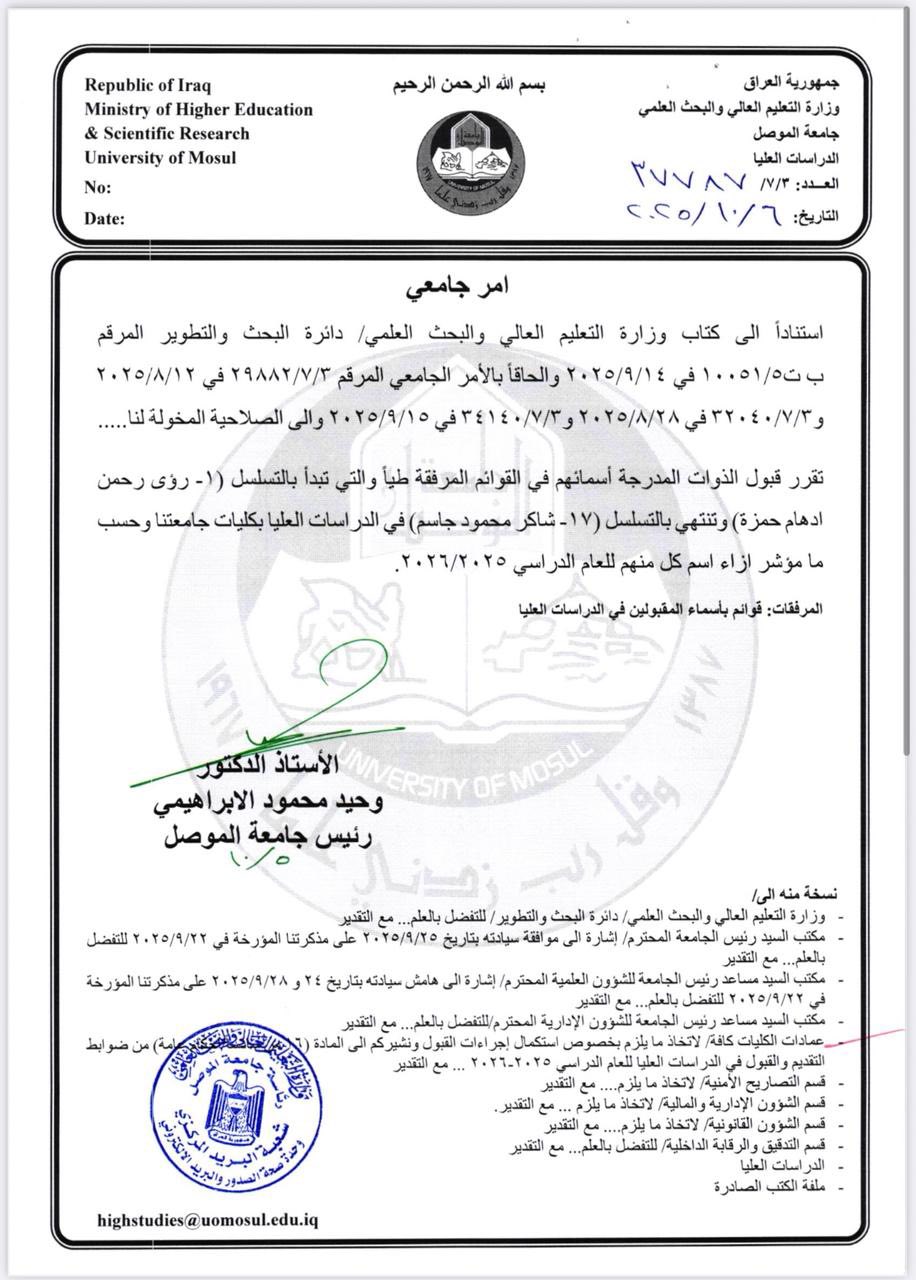 تعلن شعبة الدراسات العليا عن صدور الامر الجامعي بالقبول للعام الدراسي 2025 / 2026 للمقبولين ضمن التدوير بين الجامعات ( الوجبة الثانية )فعلى الطلبة المقبولين مراجعة شعبة الدراسات العليا في الكلية لاستكمال اجراءات القبول من الفحص الطبي ، الاجازة الدراسية للموظفين ، الكفالة .. وستكون المباشرة خلال مدة اسبوع .
