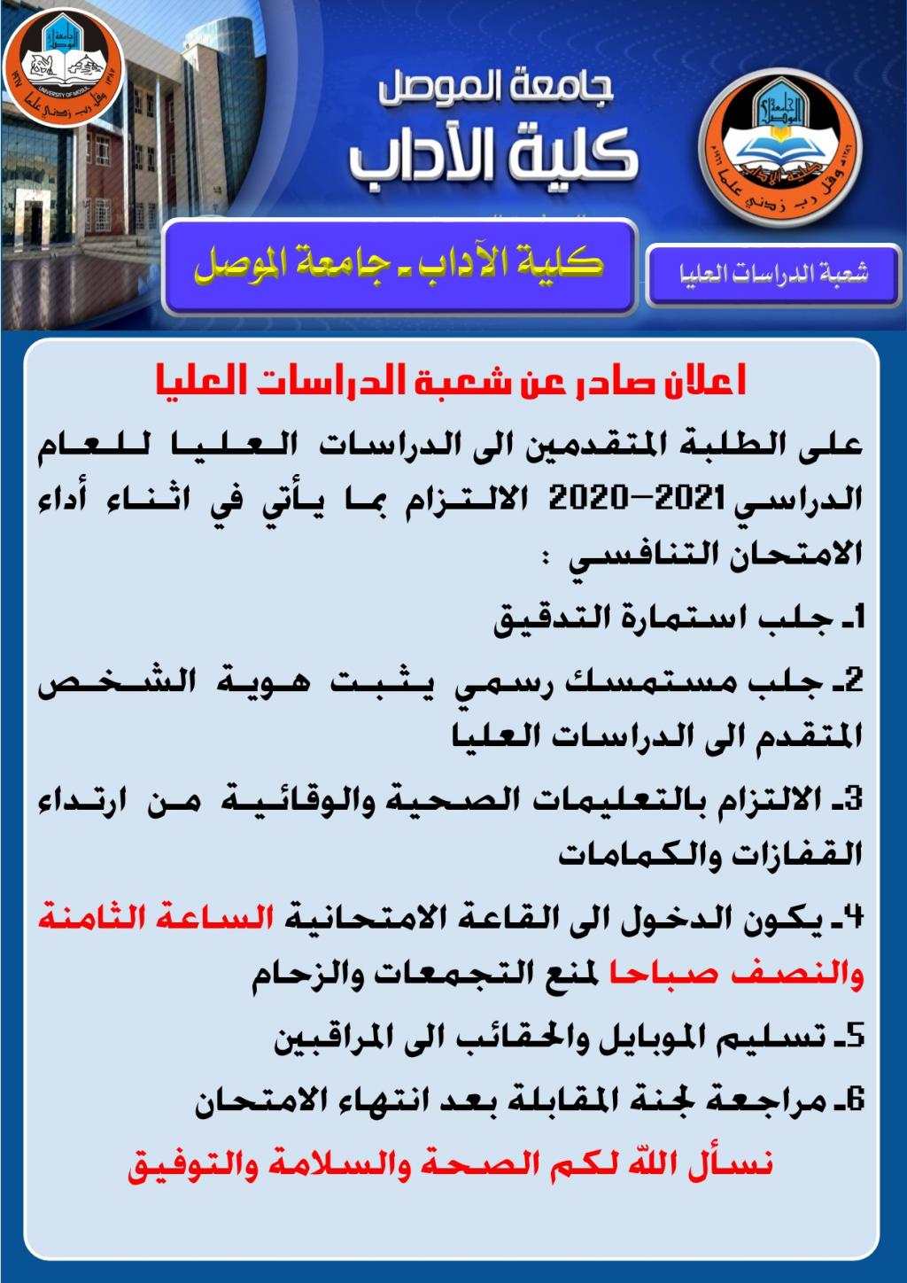 على الطلبة المتقدمين الى الدراسات العليا للعام الدراسي 2020—2021 الالتزام بما يأتي في اثناء أداء الامتحان التنافسي :1ـ جلب استمارة التدقيق2ـ جلب مستمسك رسمي يثبت هوية الشخص المتقدم الى الدراسات العليا3ـ الالتزام بالتعليمات الصحية والوقائية من ارتداء القفازات والكمامات4ـ يكون الدخول الى القاعة الامتحانية الساعة الثامنة والنصف صباحا لمنع التجمعات والزحام5ـ تسليم الموبايل والحقائب الى المراقبين6ـ مراجعة لجنة المقابلة بعد انتهاء الامتحاننسأل الله لكم الصحة والسلامة والتوفيق