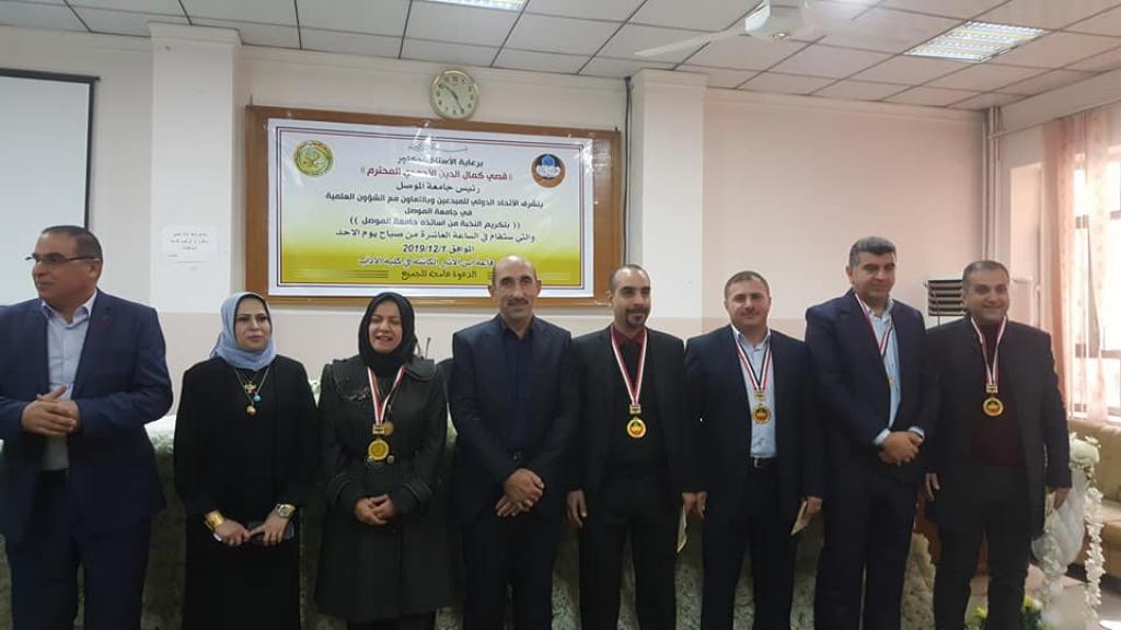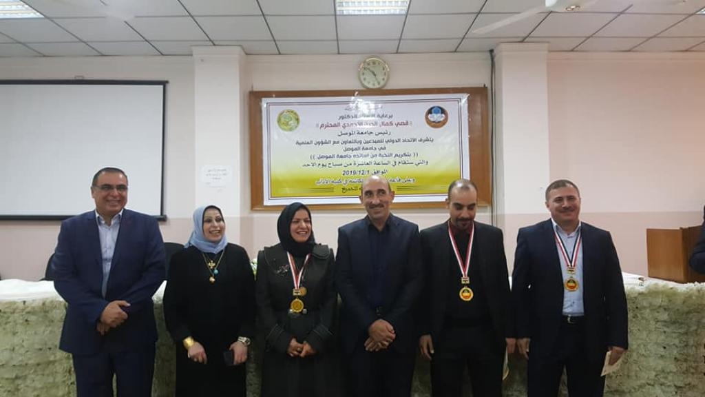 بحضور معاون عميد كلية الاداب للشؤون العلمية الاستاذ الدكتور حارث حازم ايوب المحترم وبحضور رئيس اتحاد المبدعين الدولي / الموصل د. علي غانم المحترم كرم الاتحاد الدولي للمبدعين بالتعاون مع الشؤون العلمية في رئاسة جامعة الموصل نخبة من التدريسيين المبدعين اليوم الاحد الموافق 1 / 12 / 2019 في قاعة ابن الاثير في كلية الاداب